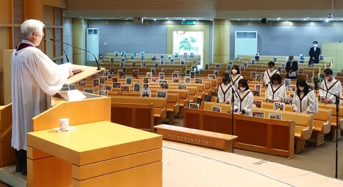 신종 코로나바이러스 감염증(코로나19) 확산 방지를 위한 사회적 거리두기 시행 중인 지난 12일 부활절을 맞아 경기 성남시 분당소망교회가 신자들의 사진을 예배당 좌석에 붙여놓고 온라인 예배를 진행하고 있다. 뉴시스