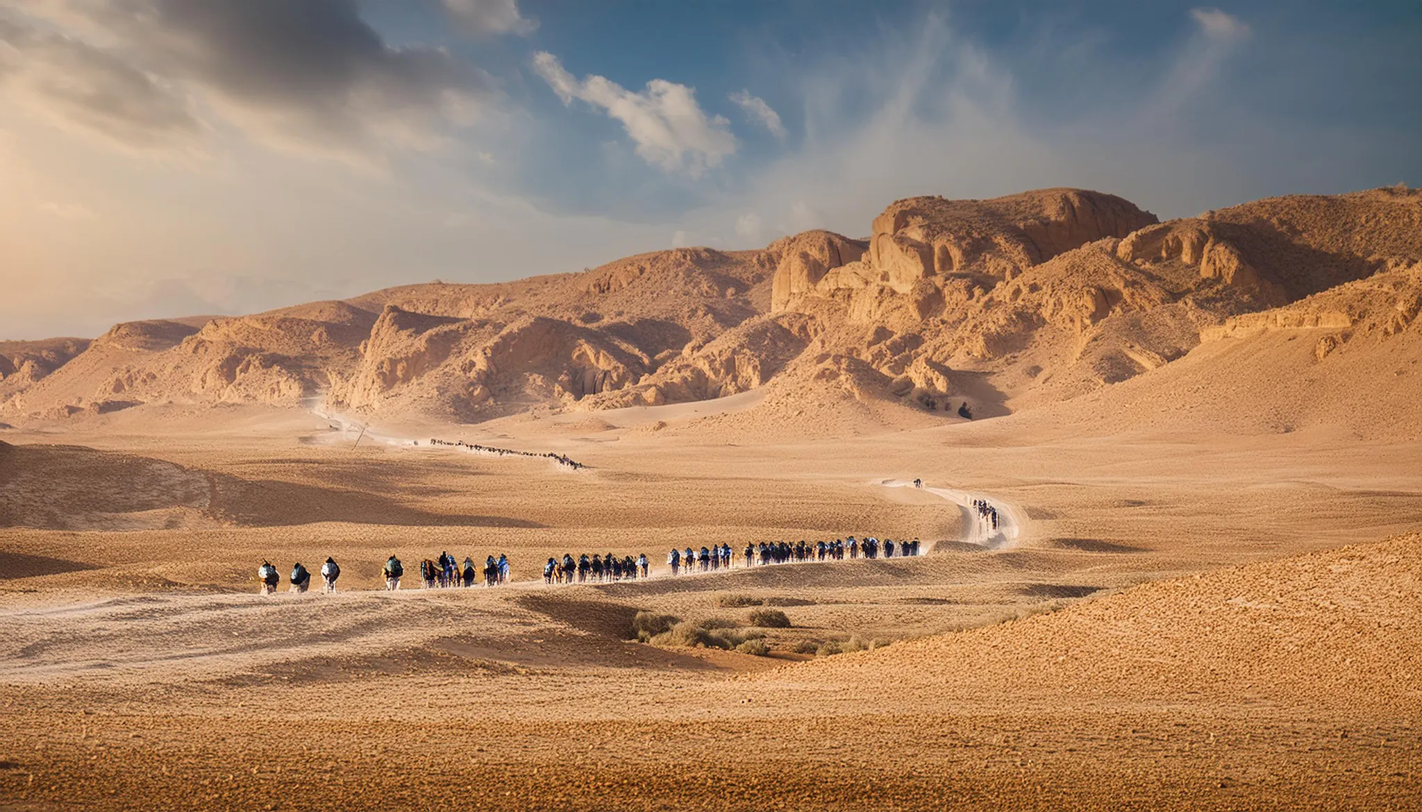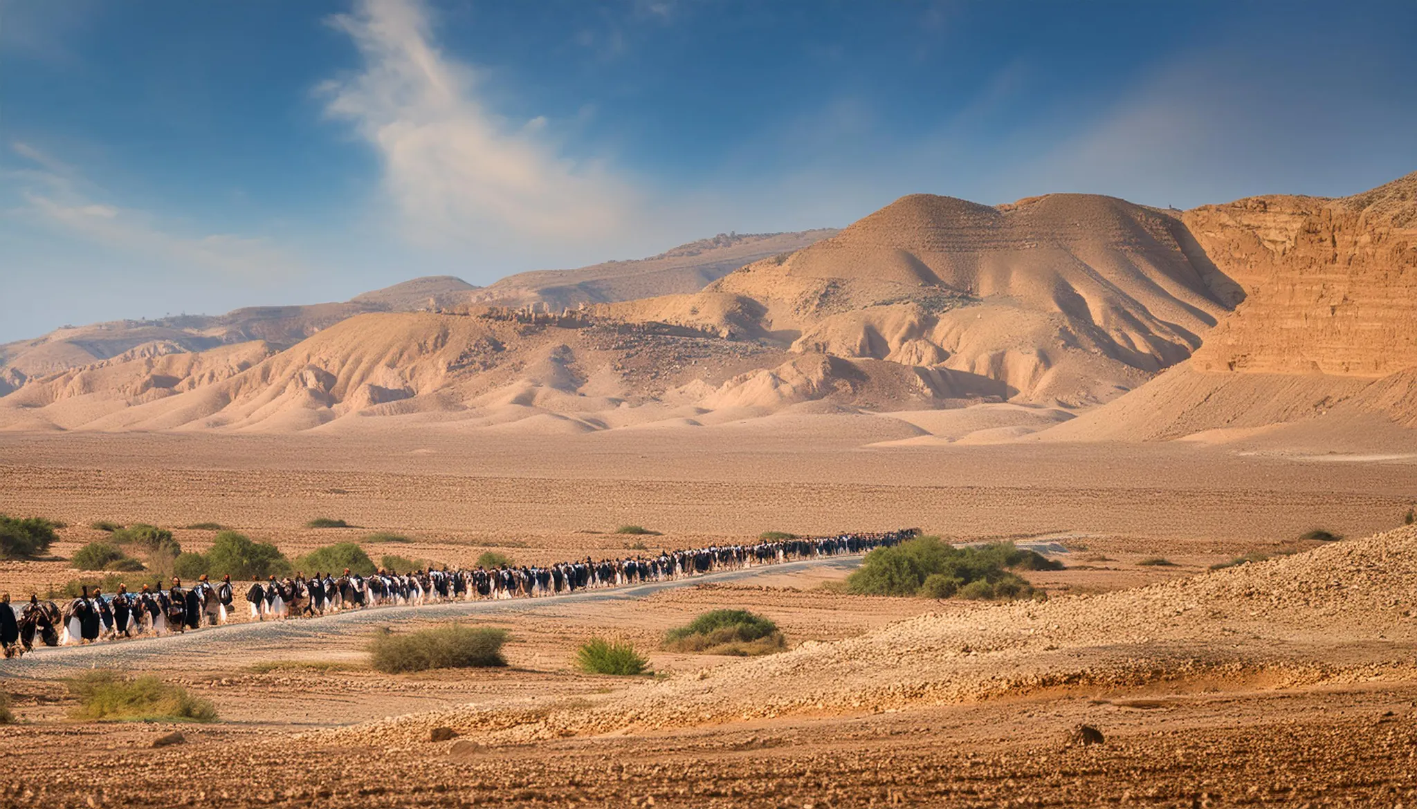 ‘이스라엘 광야에 줄지어 걸어가는 수 많은 사람이 있는 이미지’ 라는 프롬프트(prompt)를 작성하여 두가지 시안을 받았습니다.