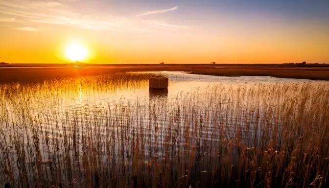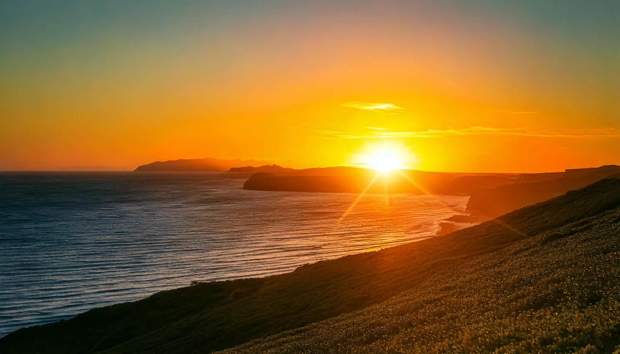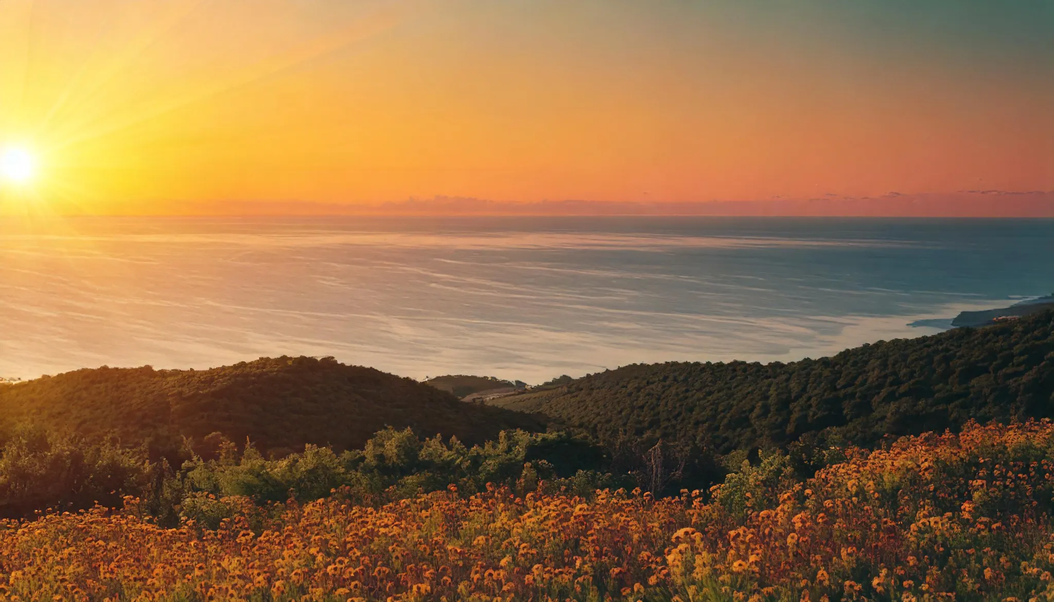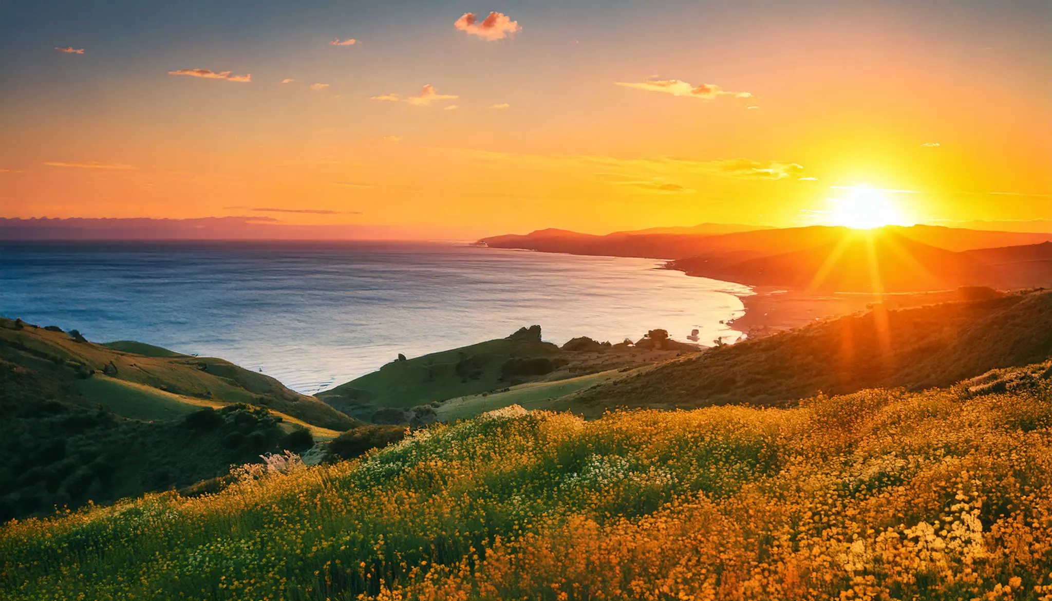 옅은 주황빛색 하늘, 일출, 꽃이 피어있는 언덕넘어에 보이는 바다와 화려한 직선 햇빛 플레어