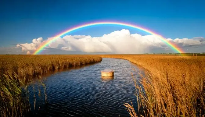 흔히 알고있는 나일강 갈대상자 이미지 입니다. 다양한 느낌을 만들어보기 위해 해가지는 하늘 / 무지개가 떠 있는 하늘 / 보라빛 하늘 등 다양한 프롬프트(prompt)를 넣어서 이미지를 생성했습니다. 특히 디자인적 요소를 더하기 위해 하늘의 색감과 별, 무지개 같은 요소를 추가하여 최종적으로 사진같지만 보기 힘든 아름다운 이미지를 만들어 낼 수 있었습니다.