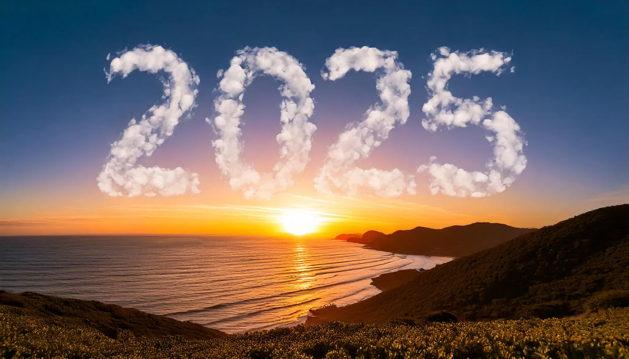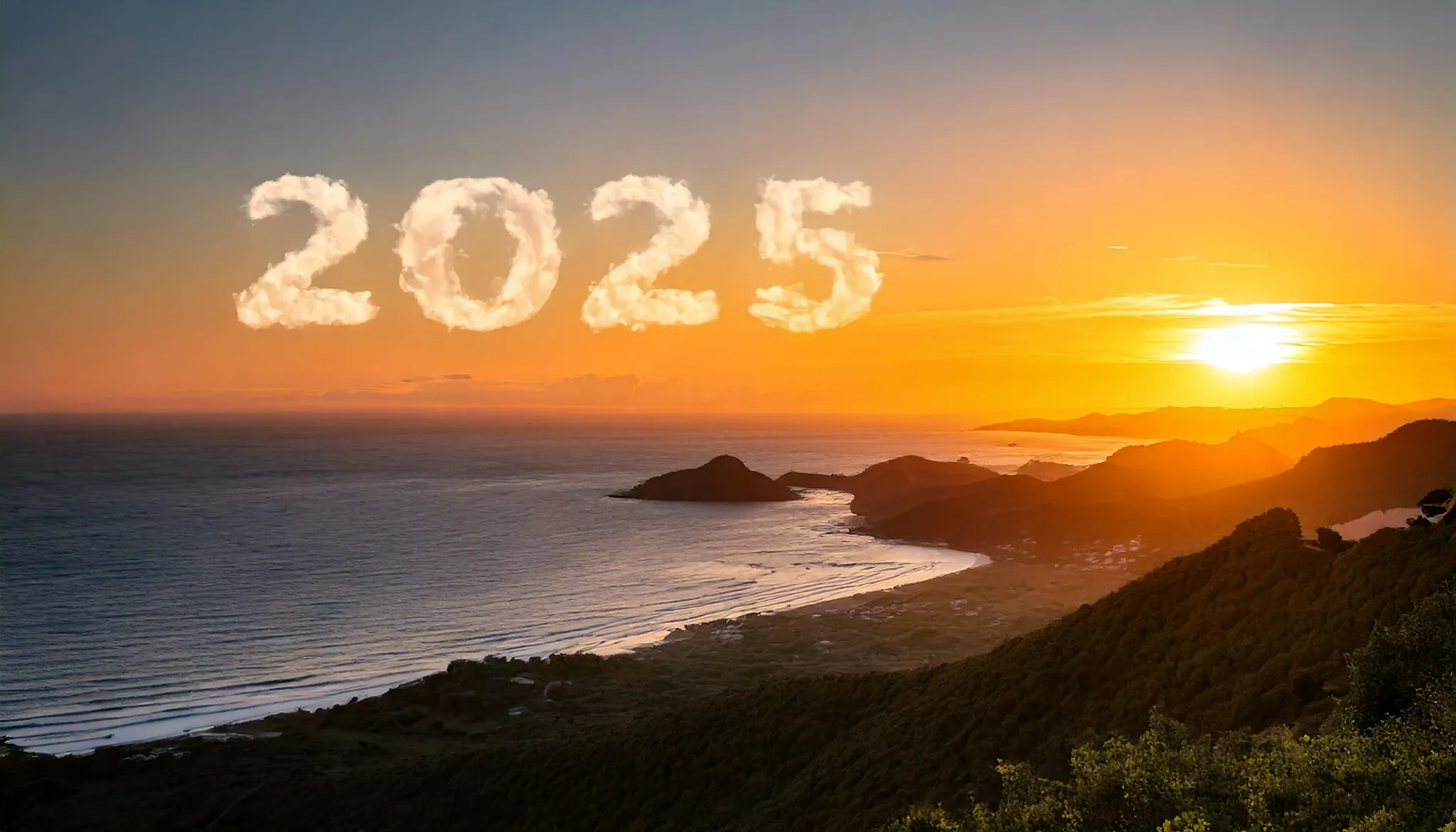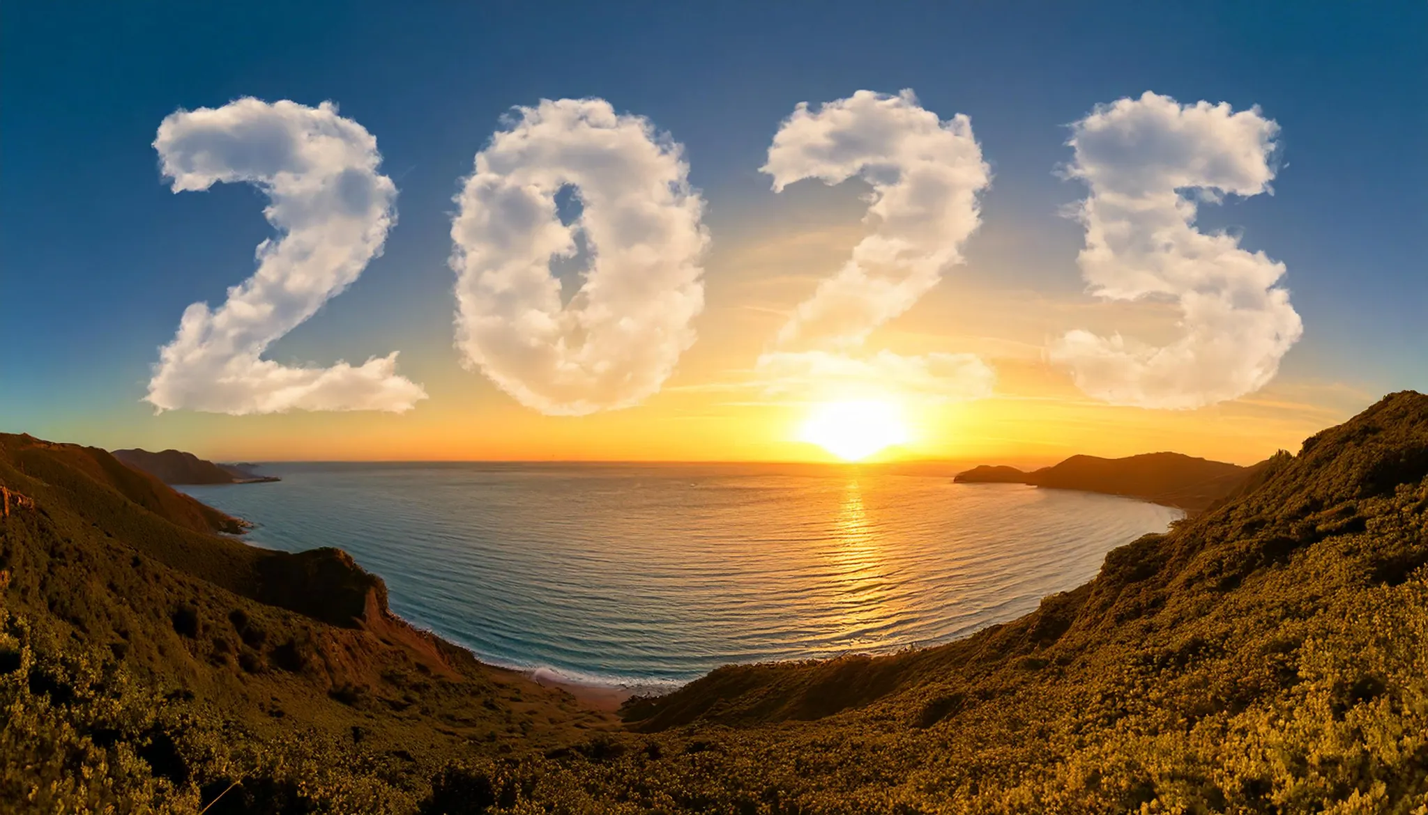 연습삼아 2025년이라는 글짜를 구름으로 나타내보았습니다. 2025 모양의 구름, 옅은 주황빛색 하늘, 일출, 언덕넘어에 보이는 바다와 화려한 햇빛 플레어