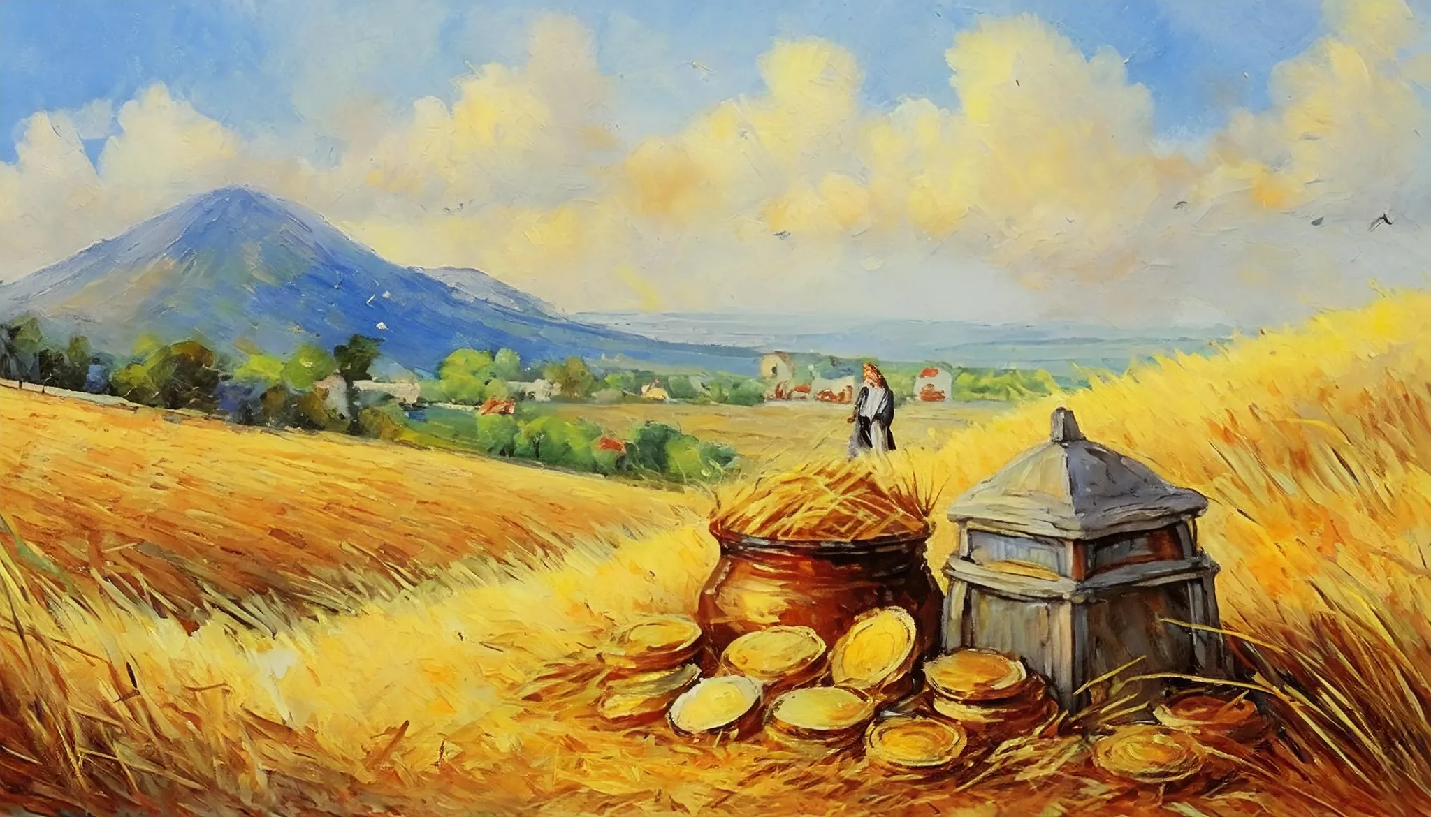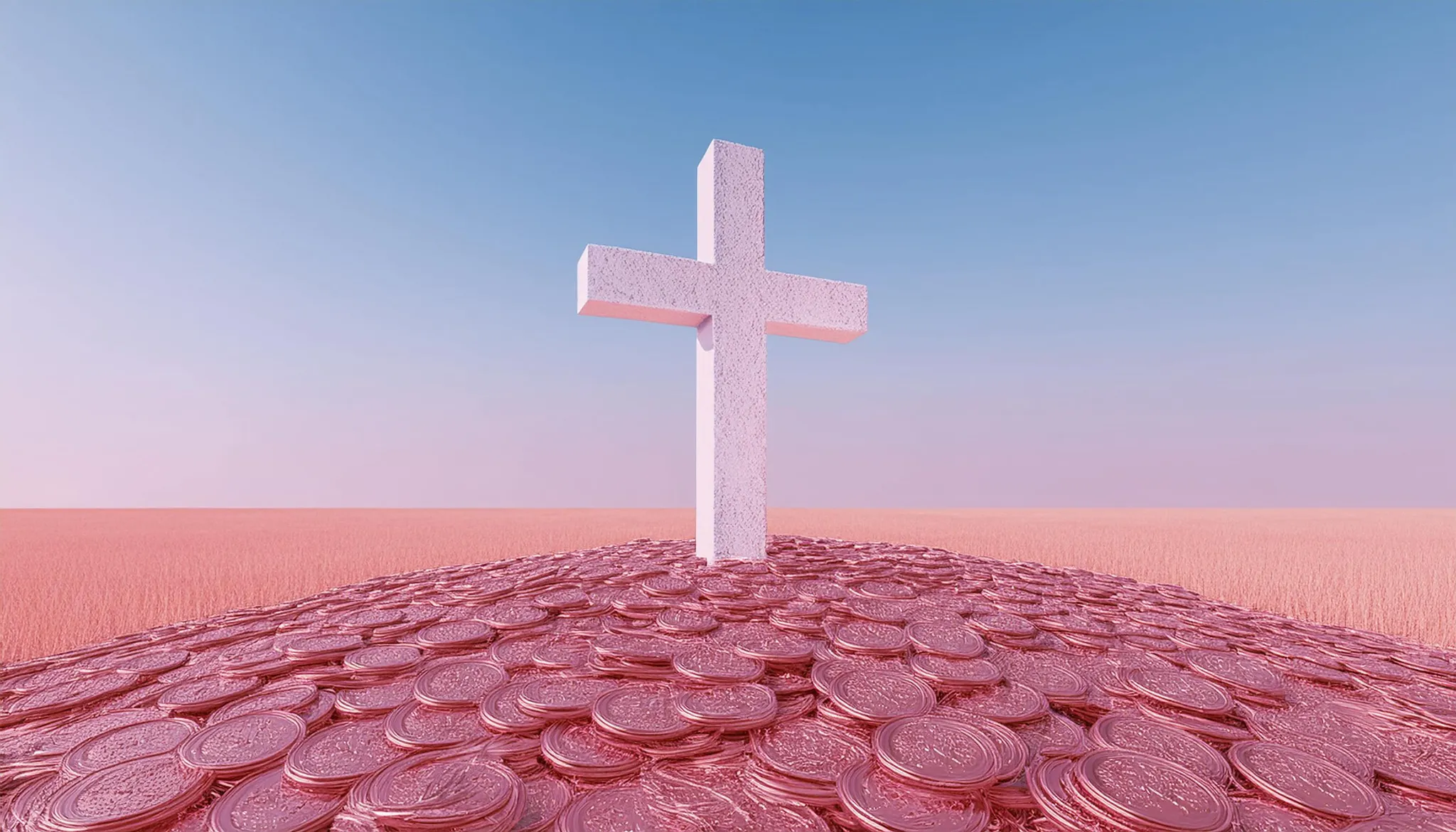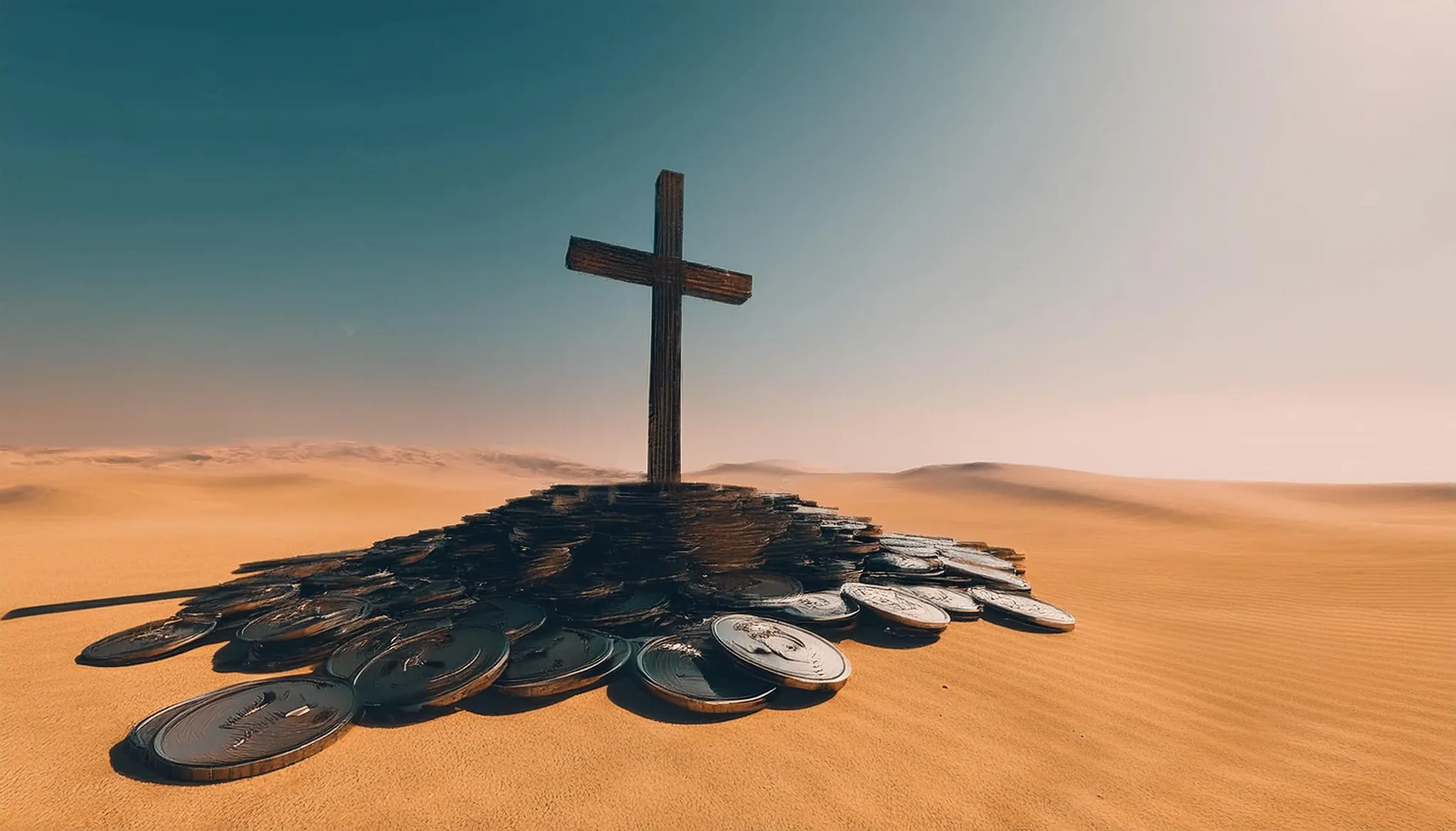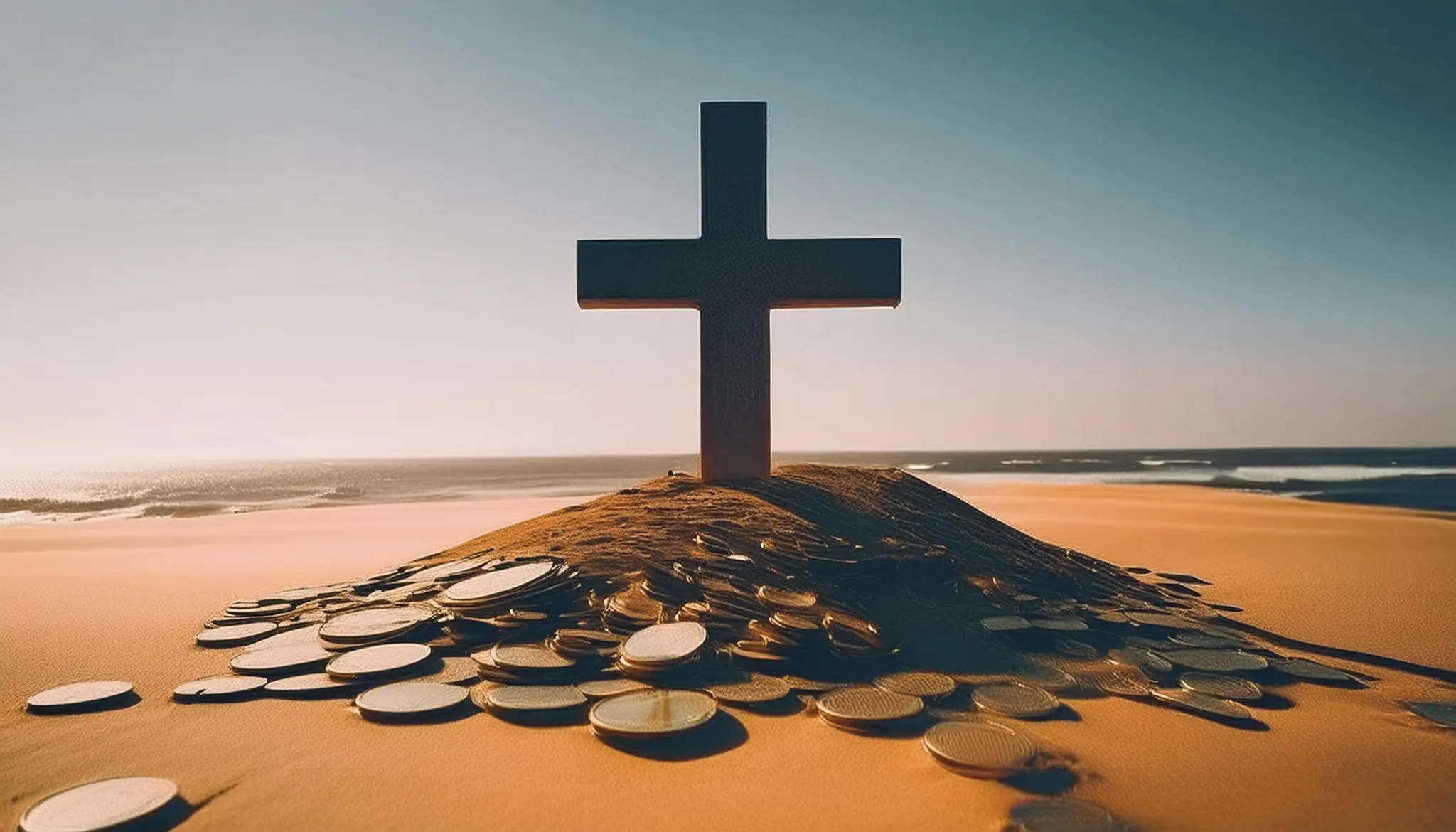 금은보화보다 귀한 예수그리스도에 관한 말씀을 나눠주셨습니다. ‘쌓여진 동전들 위에 놓여진 십자가가 좌측에 배치된 이미지’라는 프롬프트(prompt)를 넣어 이미지를 제작하였습니다.