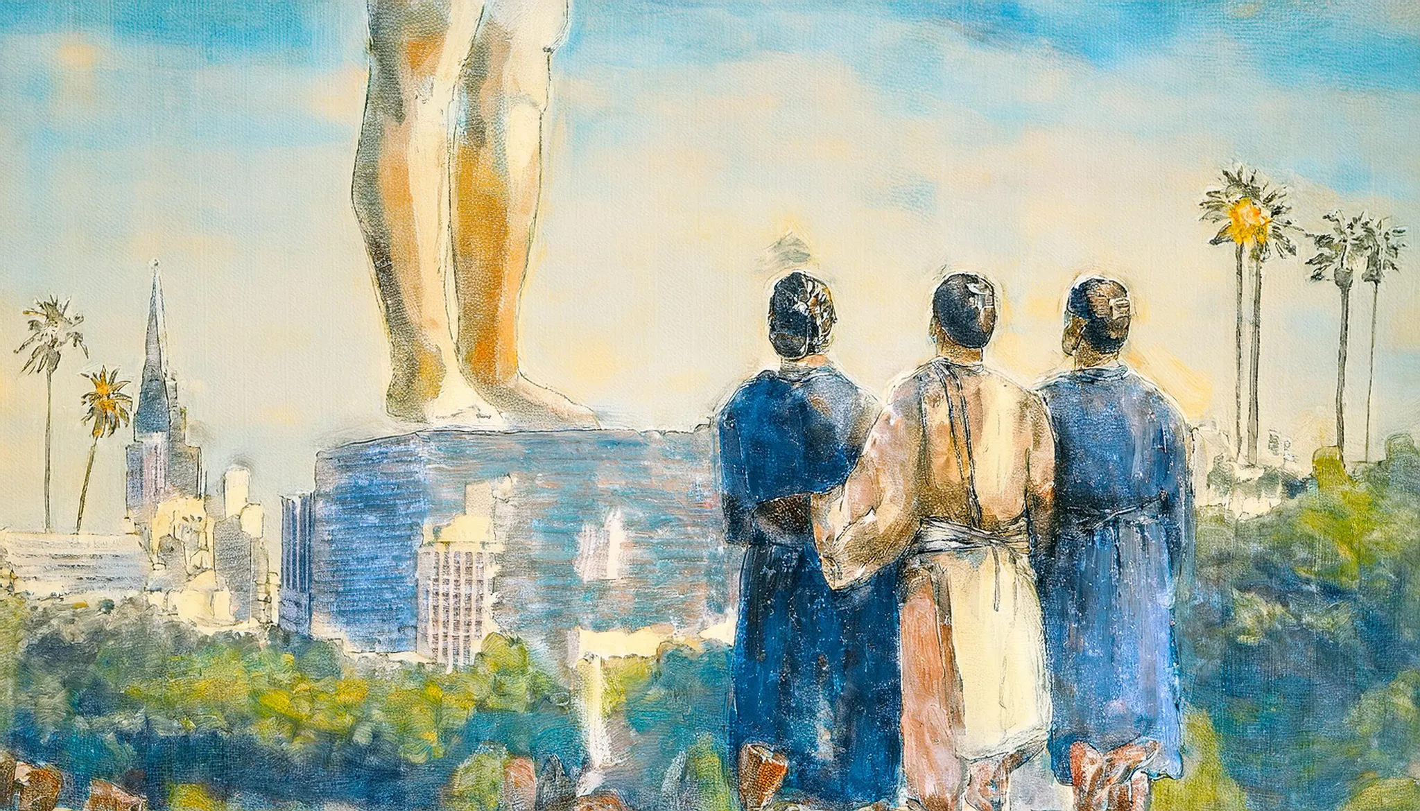 ‘우상에게 엎드려 절하고 있는 많은 사람들 사이에 서 있는 3명의 남자’ 라는 프롬프트(prompt)를 넣어서 이미지를 생성했습니다.