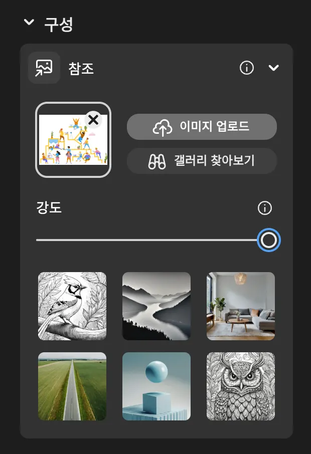 구성탭에서 제작하고 싶은 구도의 이미지나, 관련 이미지를 참조에 넣은 후 강도를 높여줍니다.