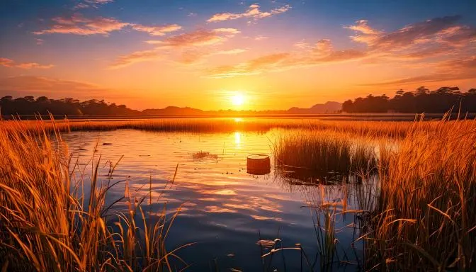 최종으로 선택한 디자인(6번) 프롬프트 : 보라빛 하늘과 넓은 갈대호수 위에 떠있는 작고 둥근 갈대상자에 빛이 비춰지는 이미지