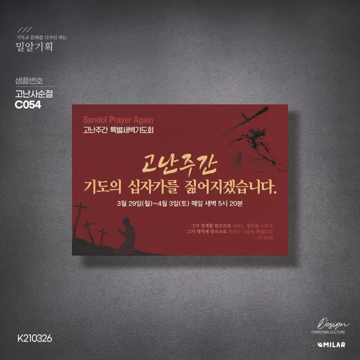 아래는 고난주간 디자인 레퍼런스 인데요, 왼쪽 밀알기획은 고난과 피 십자가 / 윤선디자인은 십자가 구원 감사 이런 느낌이 드는 것 같습니다.