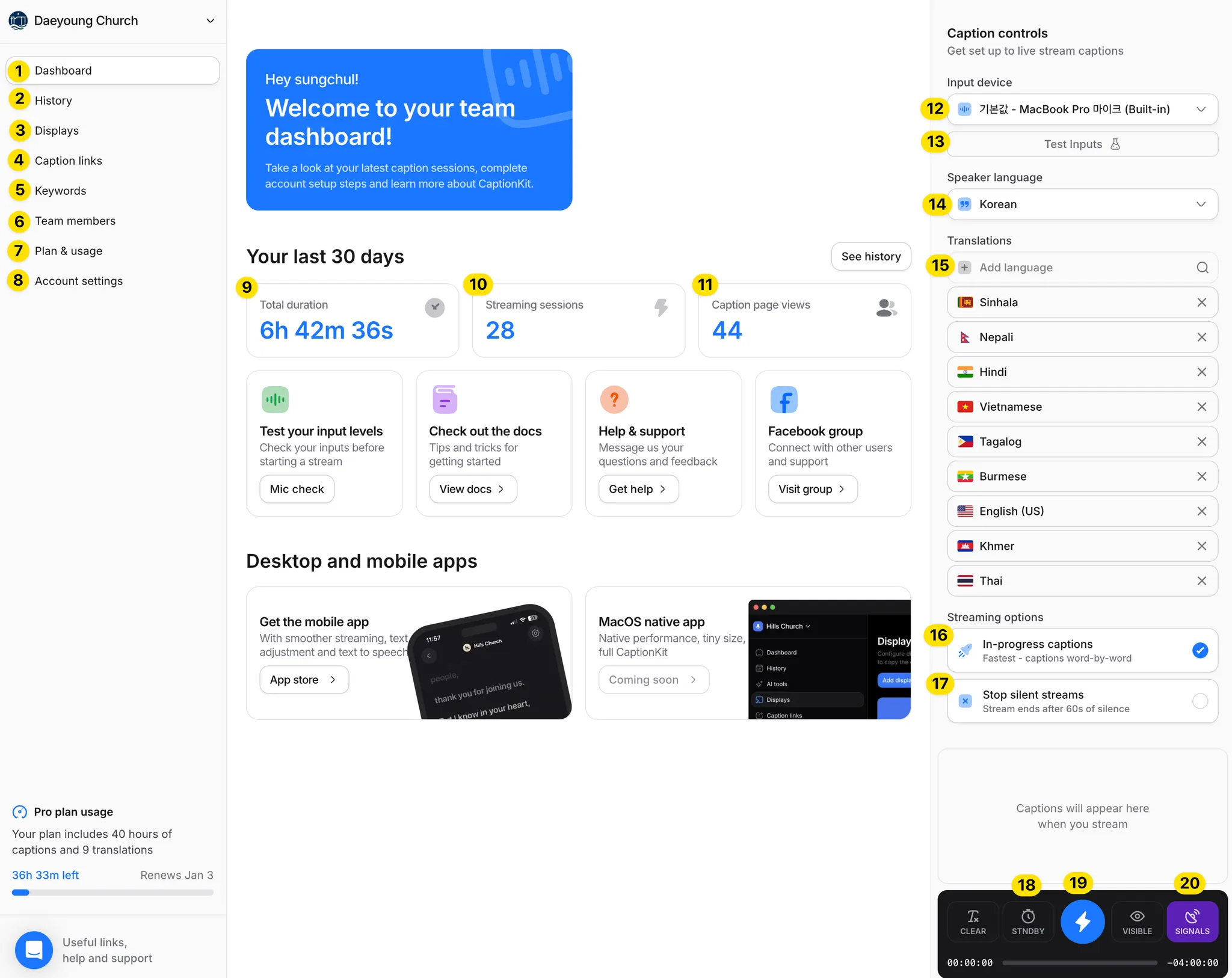 Captionkit 사이트 대시보드에서는 다양한 기능들이 있다.