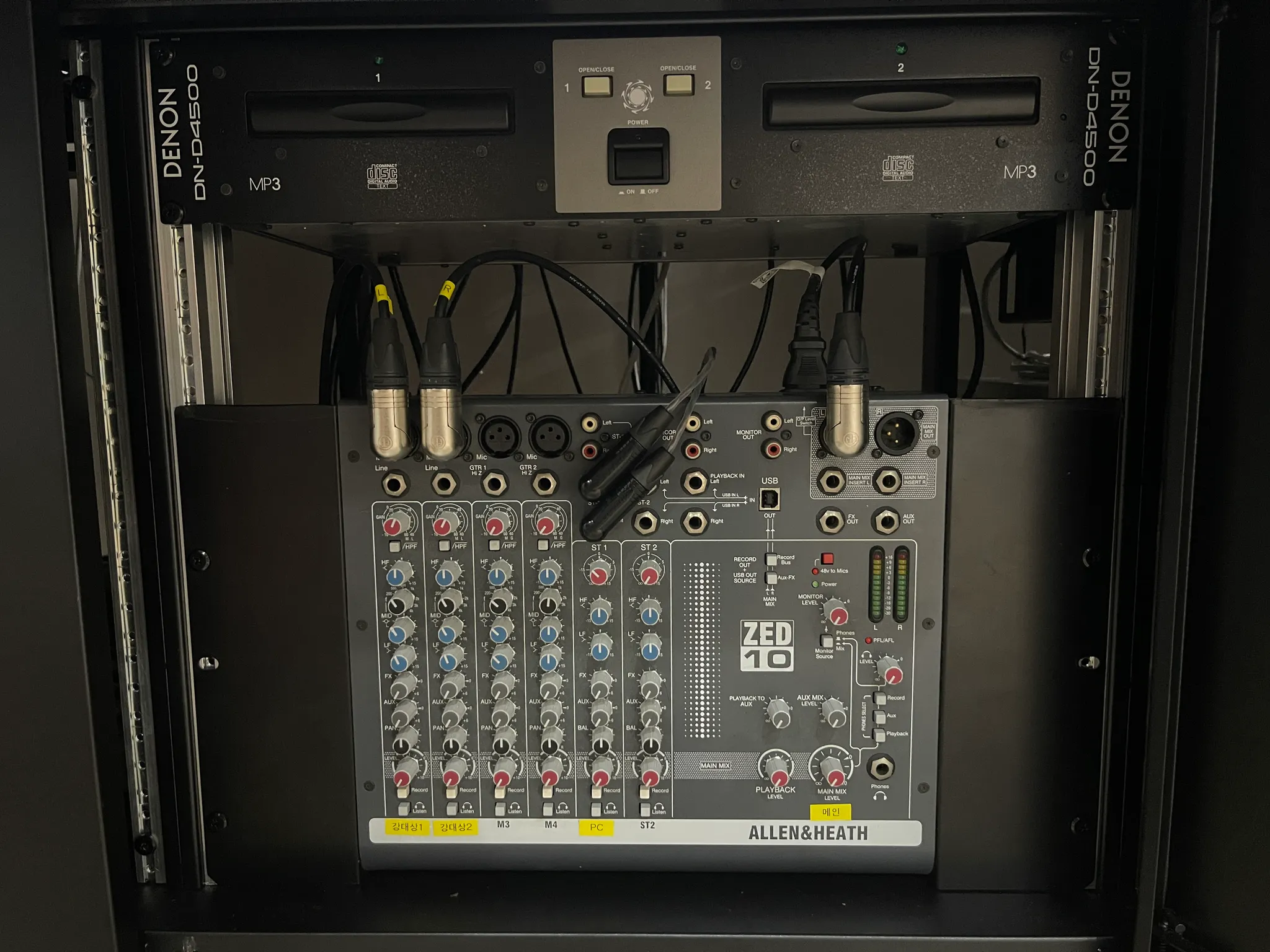 응급 백업 콘솔은 여전히 기존에도 사용했던 아날로그 ZED10입니다 강대상 마이크와 PC음악만 나올 수 있게 되있습니다 강대상 마이크를 예비1,2 포트에 꼽기만 하면 S6L 콘솔을 거치지 않고 마이크 소리는 나오도록 구성 했습니다 MIC→ZED→Mayersound Galileo