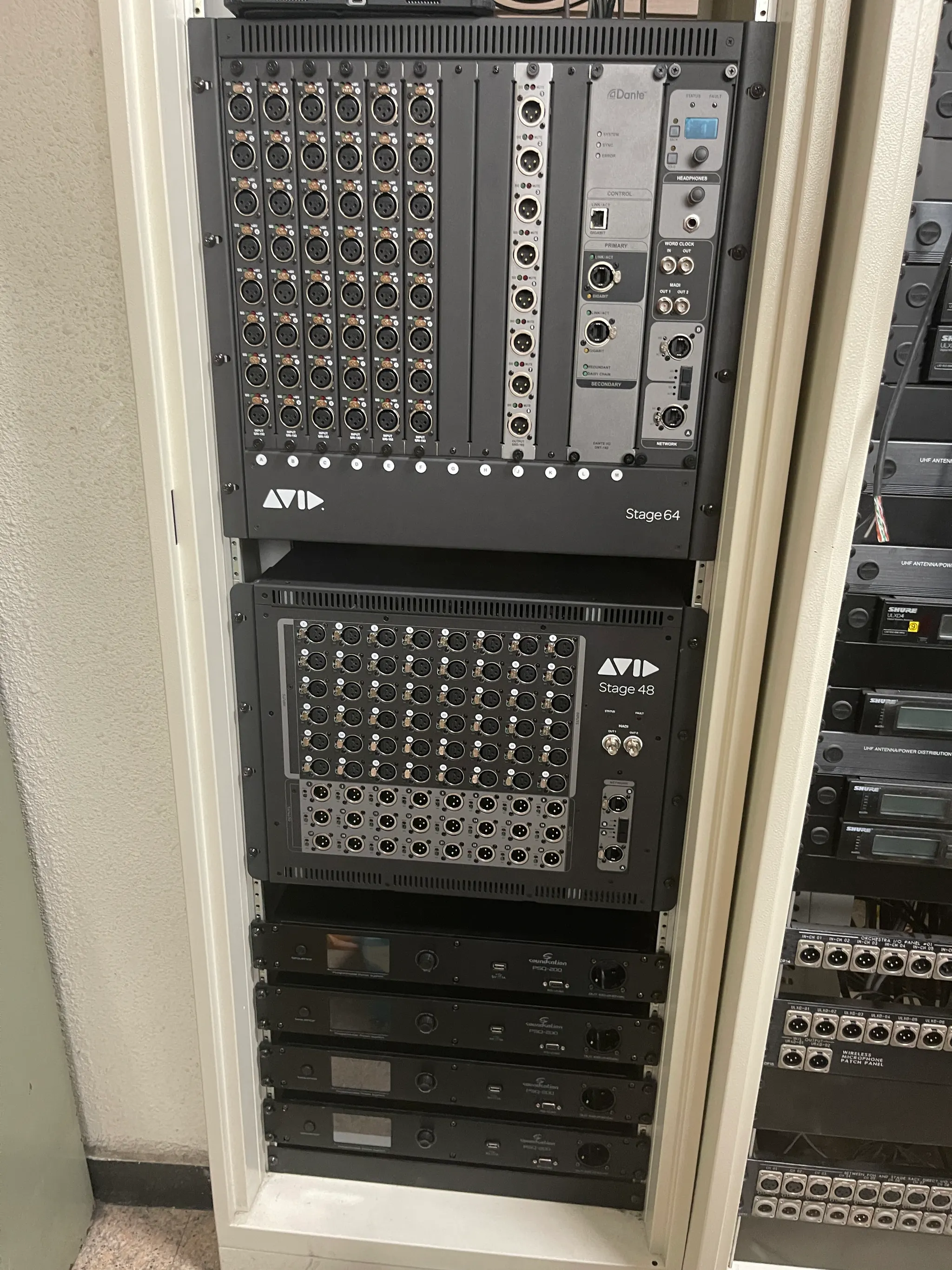 스테이지 io박스도 장착했습니다 스테이지 64와 48 두대며 총 96인풋 32아웃 구성입니다 밴드 아비옴 인이어를 위한 단테 옵션 카드도 설치했습니다.