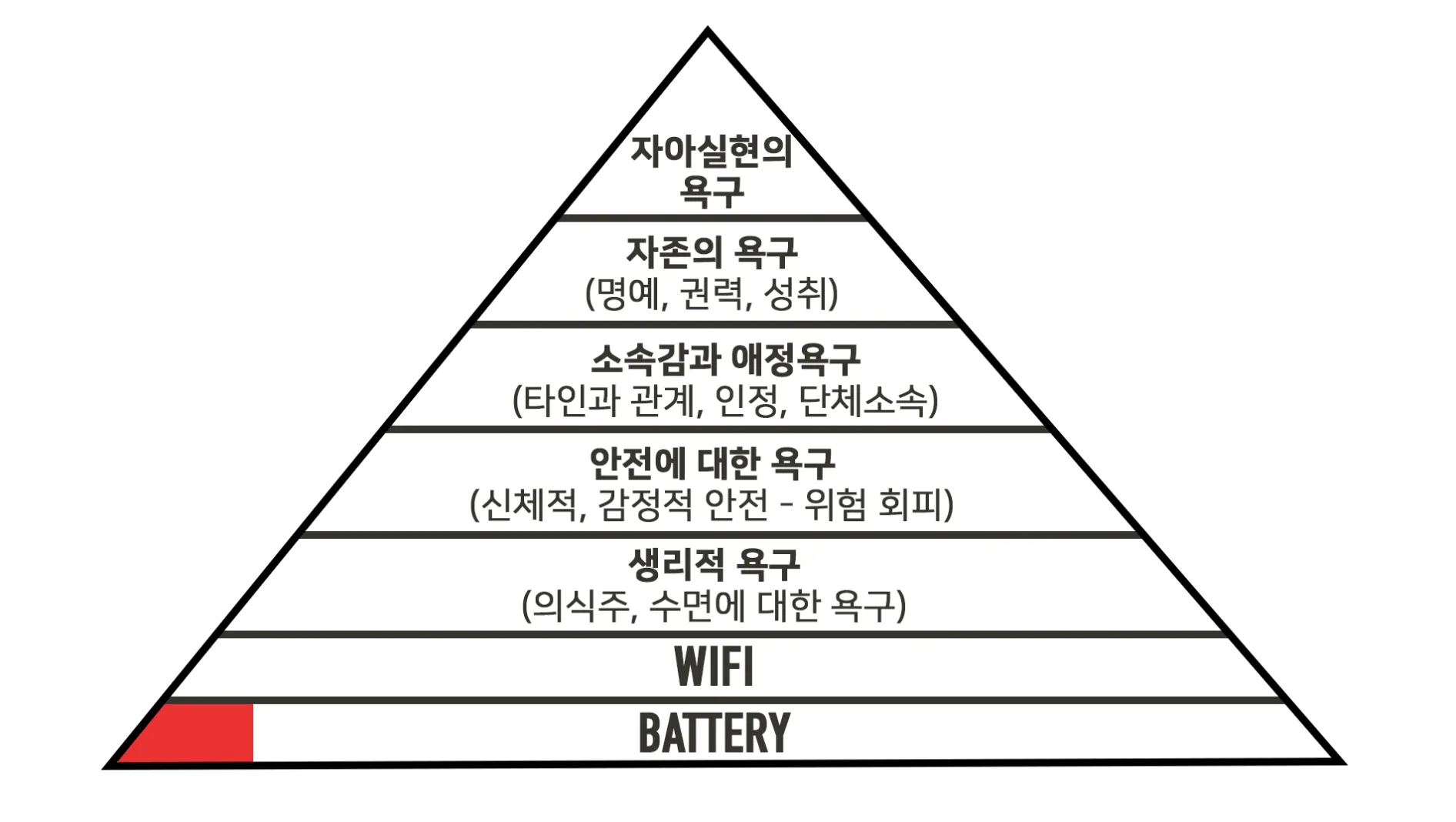 재미난 표가 있어 소개하고자 한다. 현대인들에게는 매슬로우가 주장하는 5단계 욕구 외에 두 가지의 기본욕구가 필요하다고 주장한다. 이를 '변형된 매슬로우의 7단계 욕구'라고 부른다. 추가된 두 가지 기본욕구는 와이파이와 배터리다. 와이파이와 배터리 없이 살 수 없는, 초연결 사회를 살아가는 오늘날 우리의 모습을 영화 기생충의 한 장면이 잘 묘사하고 있지 않은가.