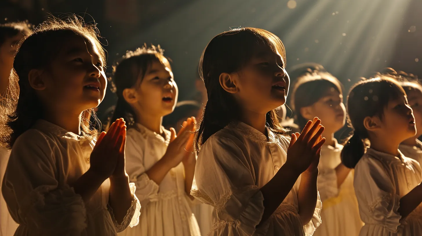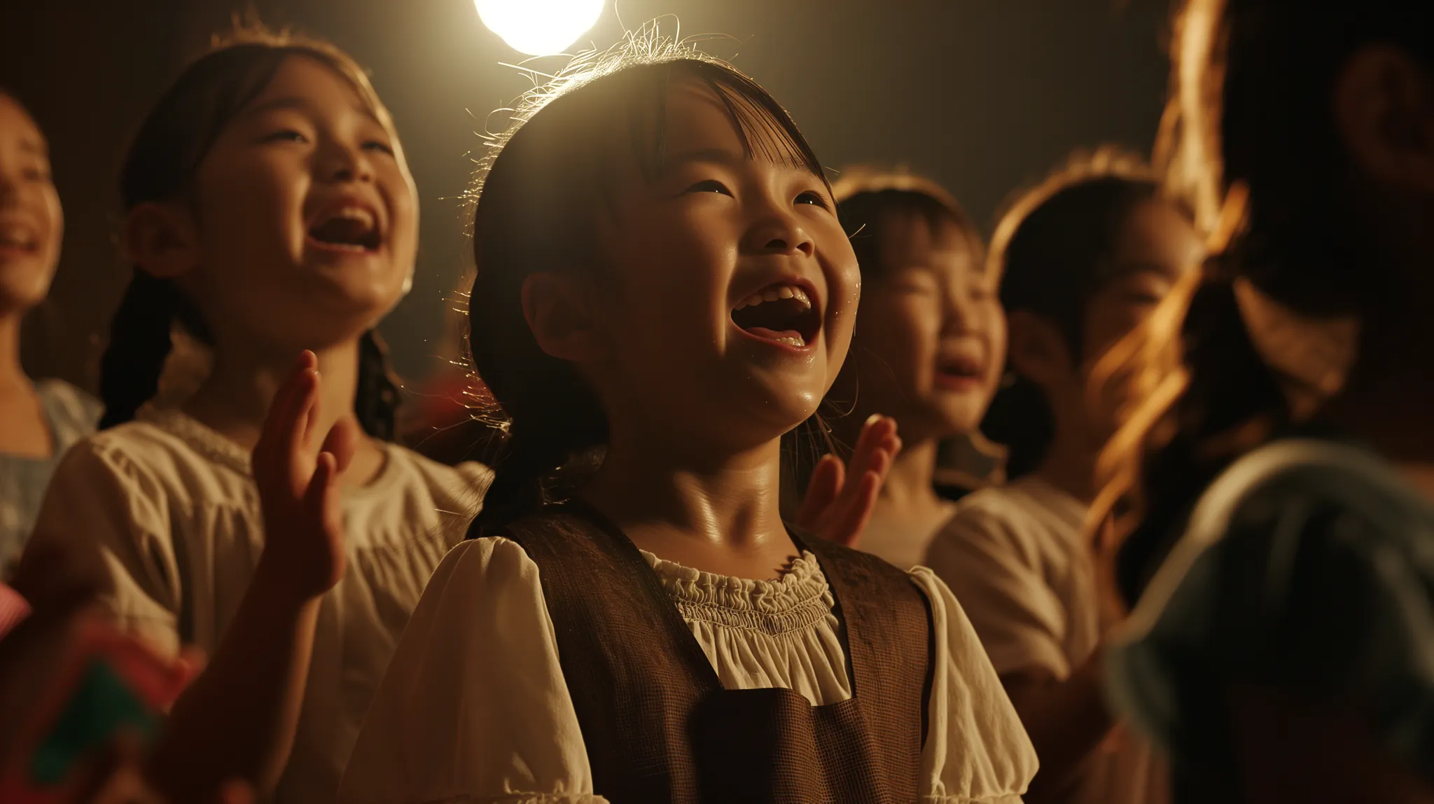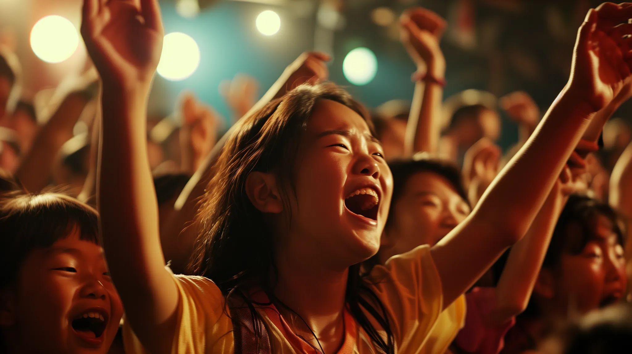 Korean kids engaged in spirited praise, filmed using a cinema camera, real-life photograph, bathed in gentle, soft lighting, emphasizing their zeal and joyful expressions in a dynamic, cinematic context --ar 16:9 --v 6.0