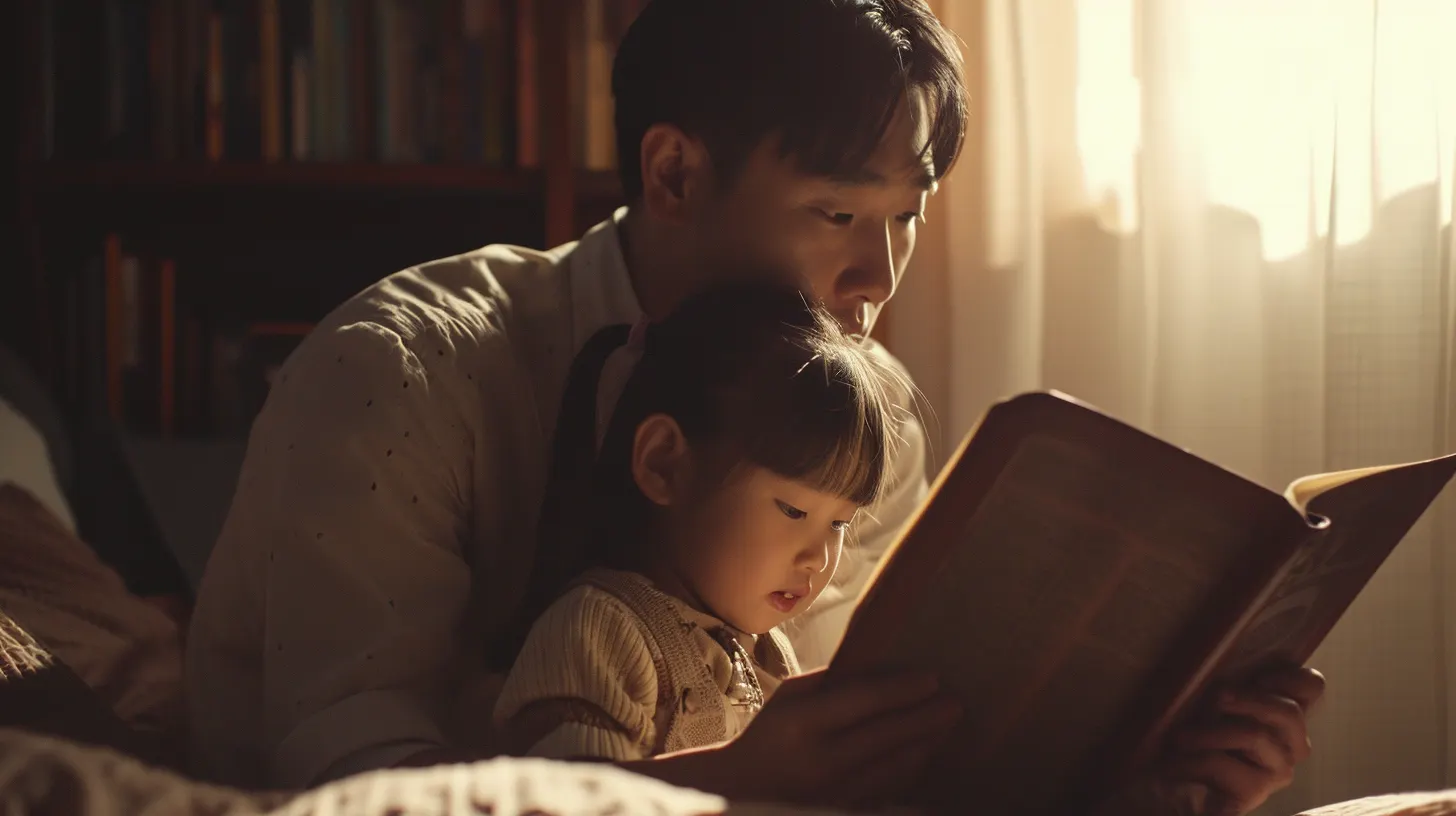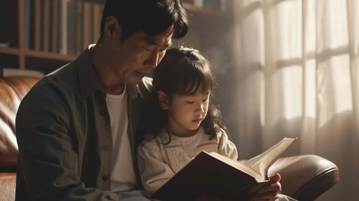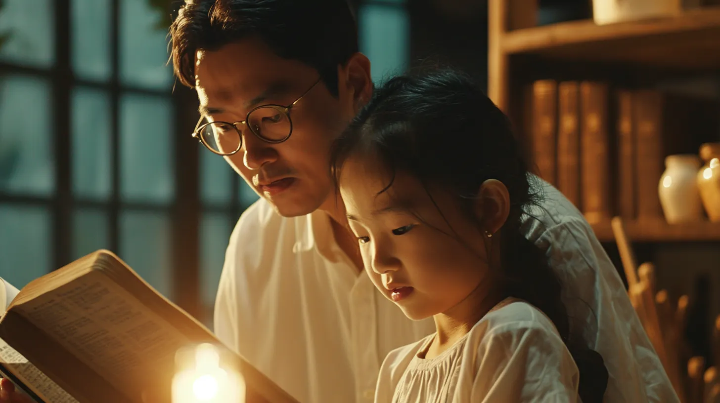 Korean father in his 40s and his 8-year-old daughter, reading the Bible together, captured with a cinema camera, in a setting of soft lighting, creating a tender and intimate moment, reflecting a bond of faith and family --ar 16:9 --v 6.0