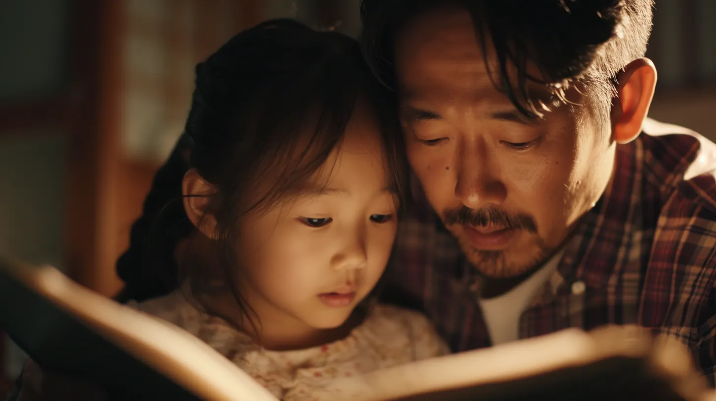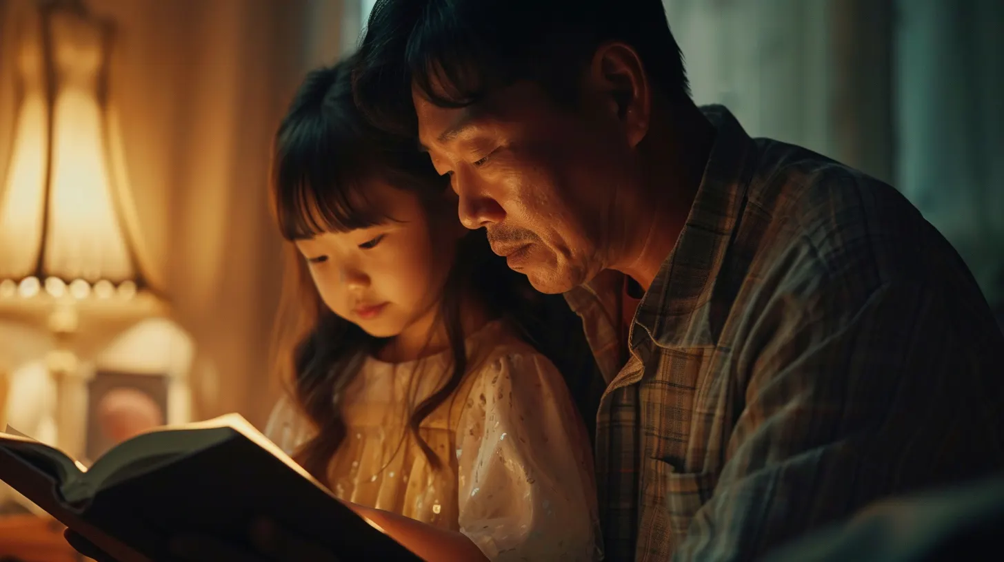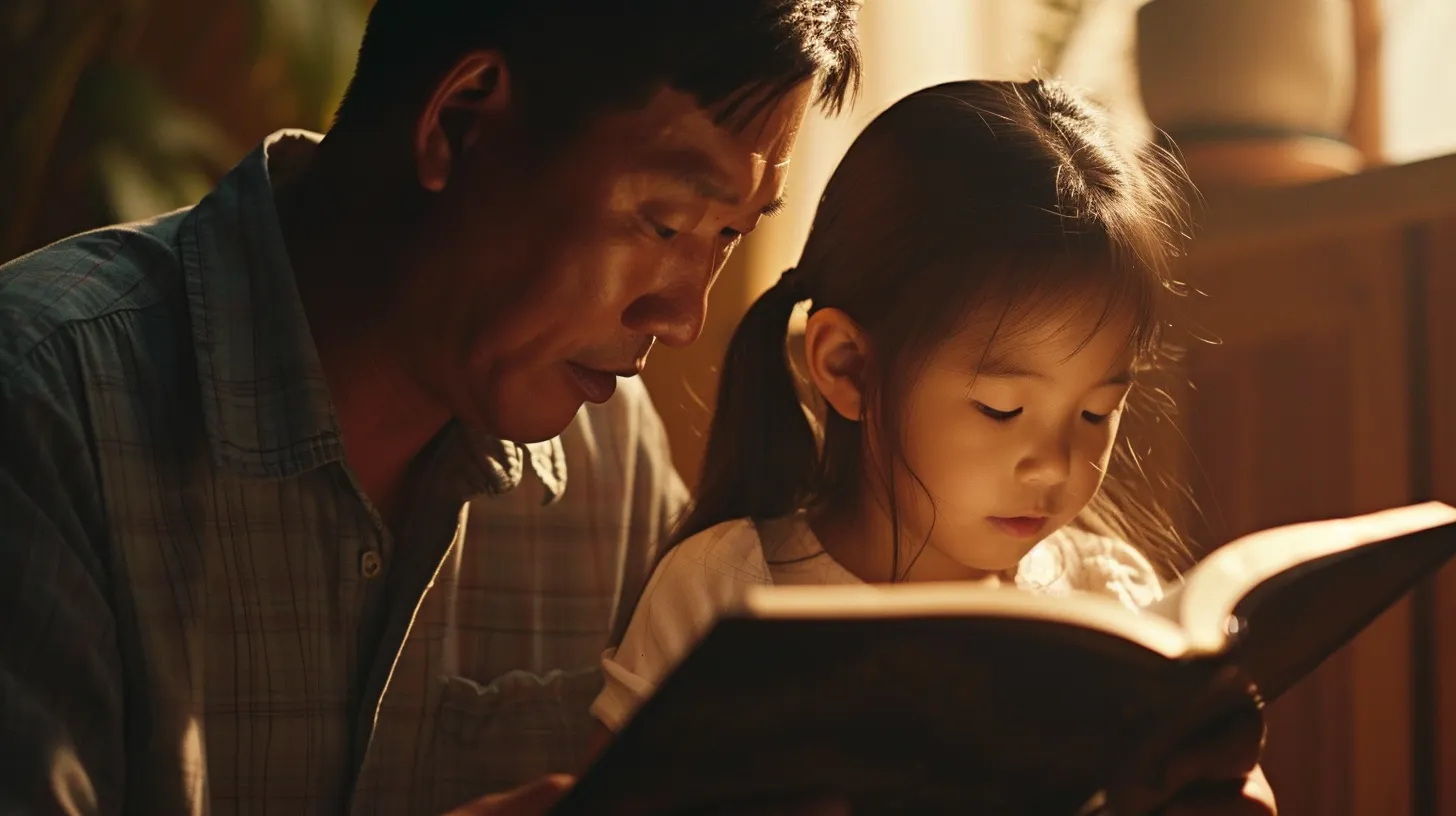 Korean father in his 40s and his 8-year-old daughter, reading the Bible together, captured with a cinema camera, in a setting of soft lighting, creating a tender and intimate moment, reflecting a bond of faith and family --ar 16:9 --v 6.0