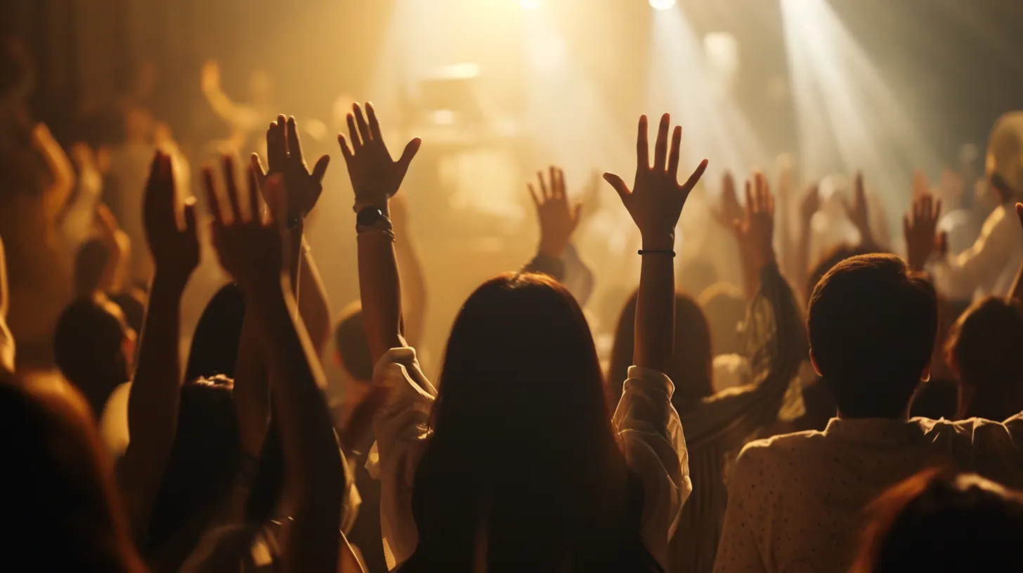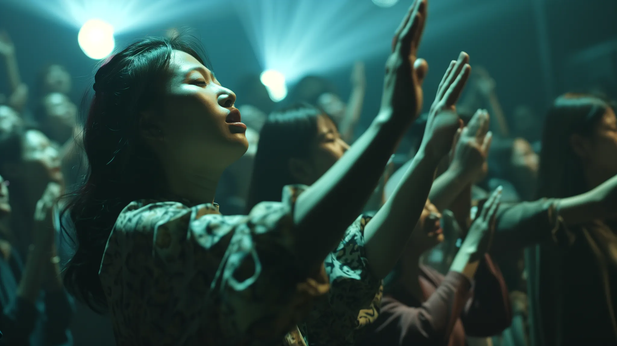 Korean congregation in their 30s and 40s at a contemporary church in 2023, engaged in heartfelt worship, raising hands in song or prayer, filmed with an FX3 Sony cinema camera, gentle lighting illuminating the worshipers' backs, capturing the depth of their faith and worship experience --ar 16:9 --v 6.0
