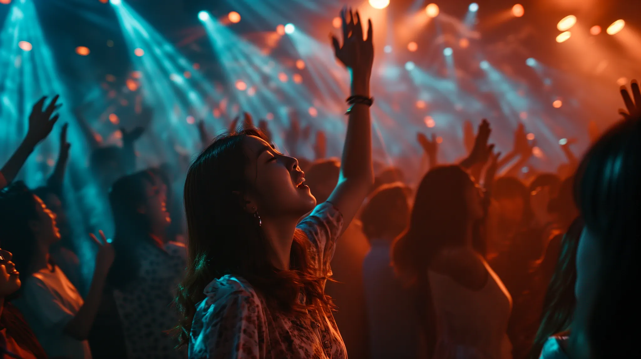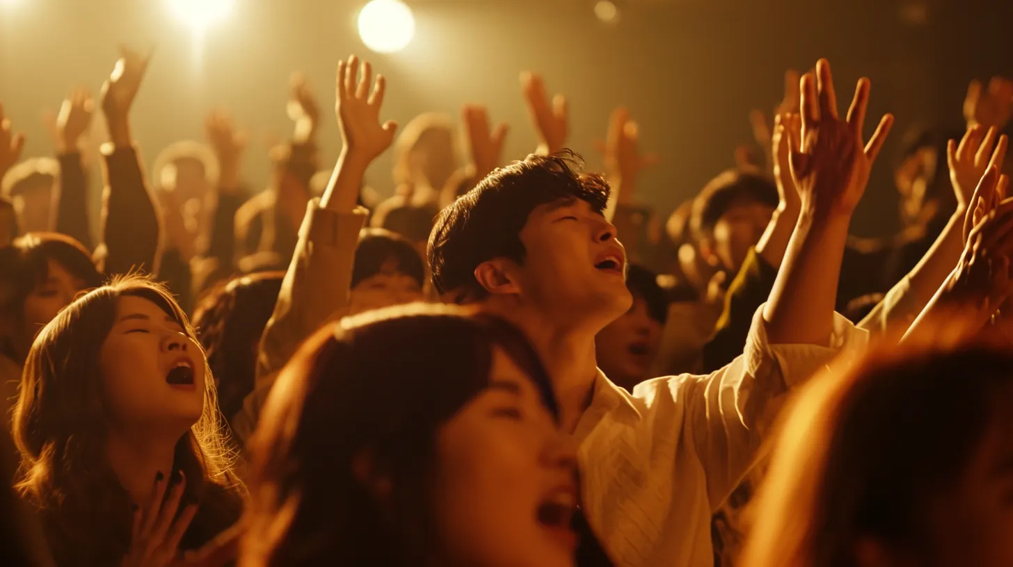 Passionate praise by Korean men and women in their 20s at a worship gathering, under beautiful lighting, scene reminiscent of a movie, captured with a cinema camera, high-quality imagery conveying the fervor and devotion of the moment --ar 16:9 --v 6.0