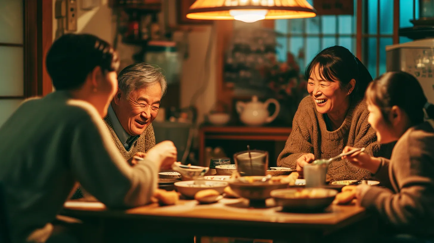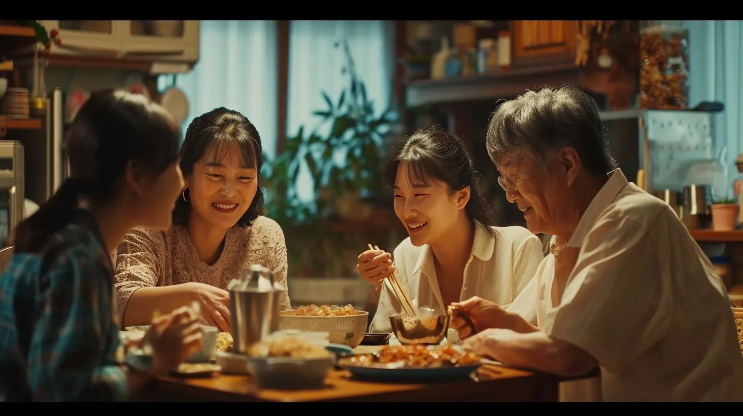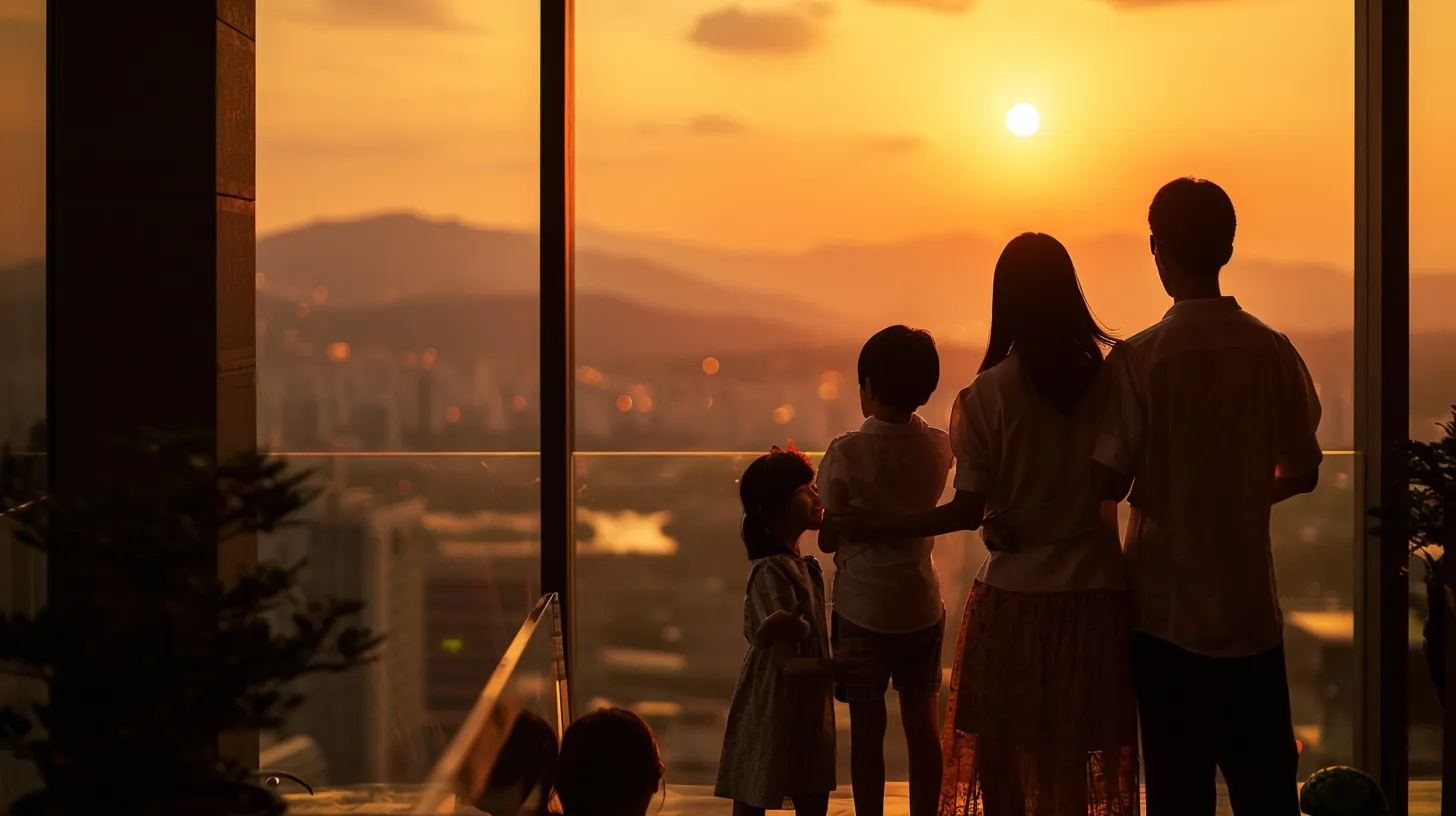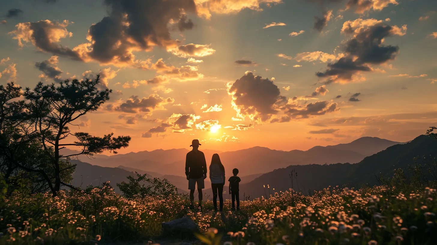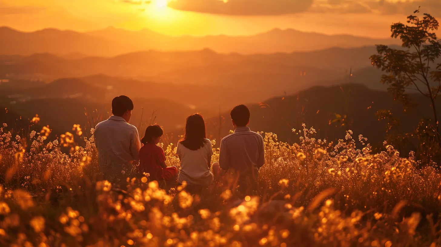 Korean family admiring a spectacular sunset, creating a scene reminiscent of a movie, real photo capturing an important moment in life, reflecting the family's gratitude as they reflect on the year, conveying a sense of warmth and togetherness in the face of nature's beauty --ar 16:9 --v 6.0