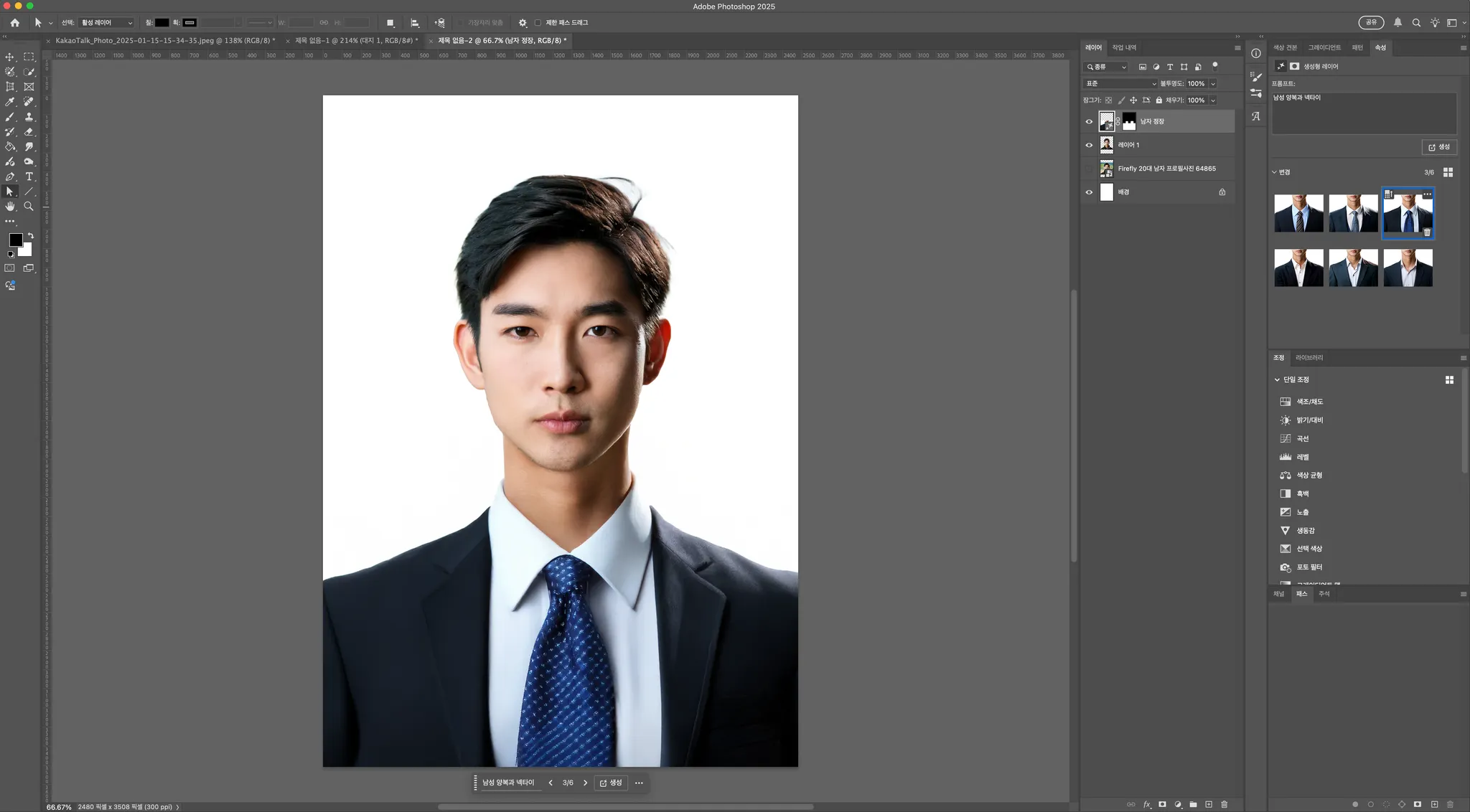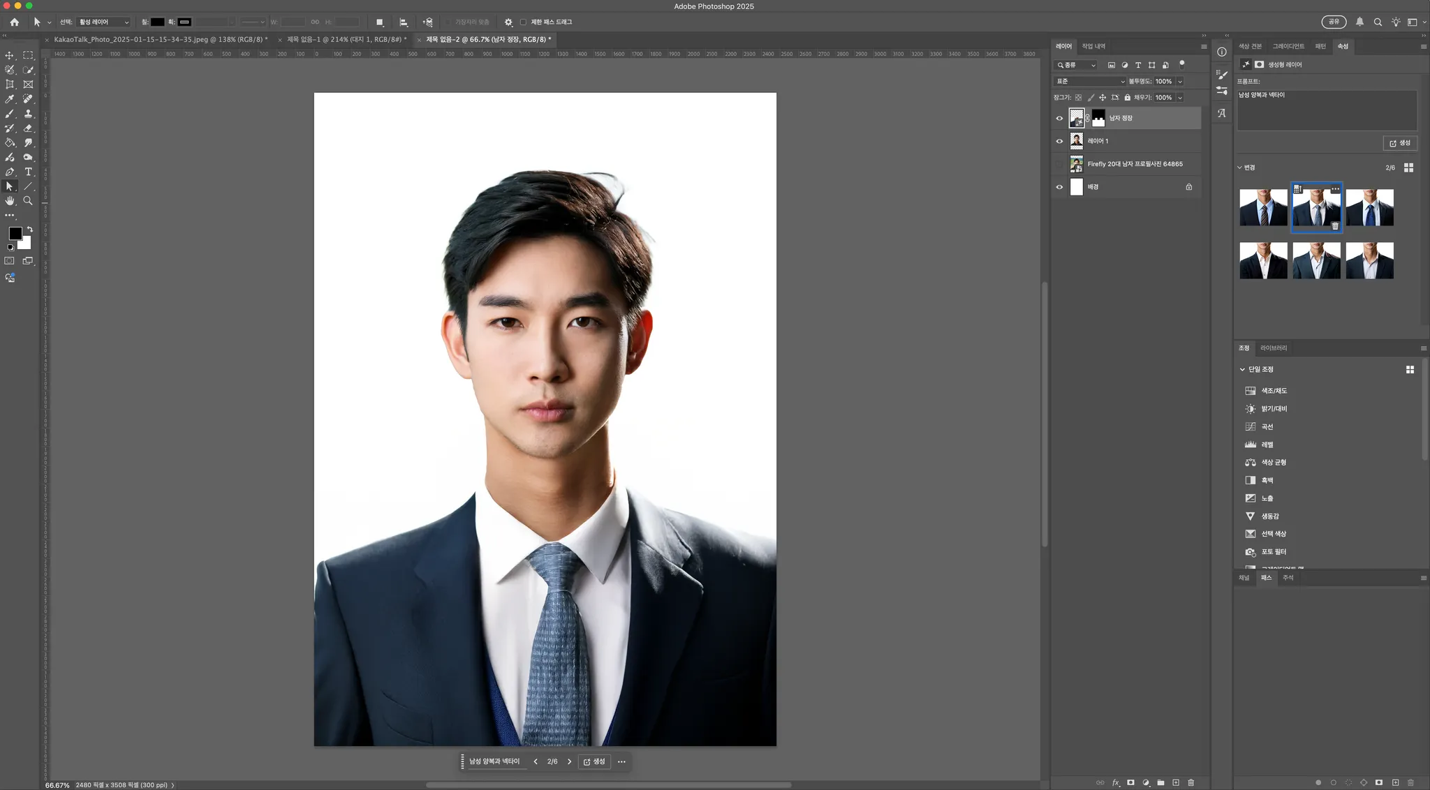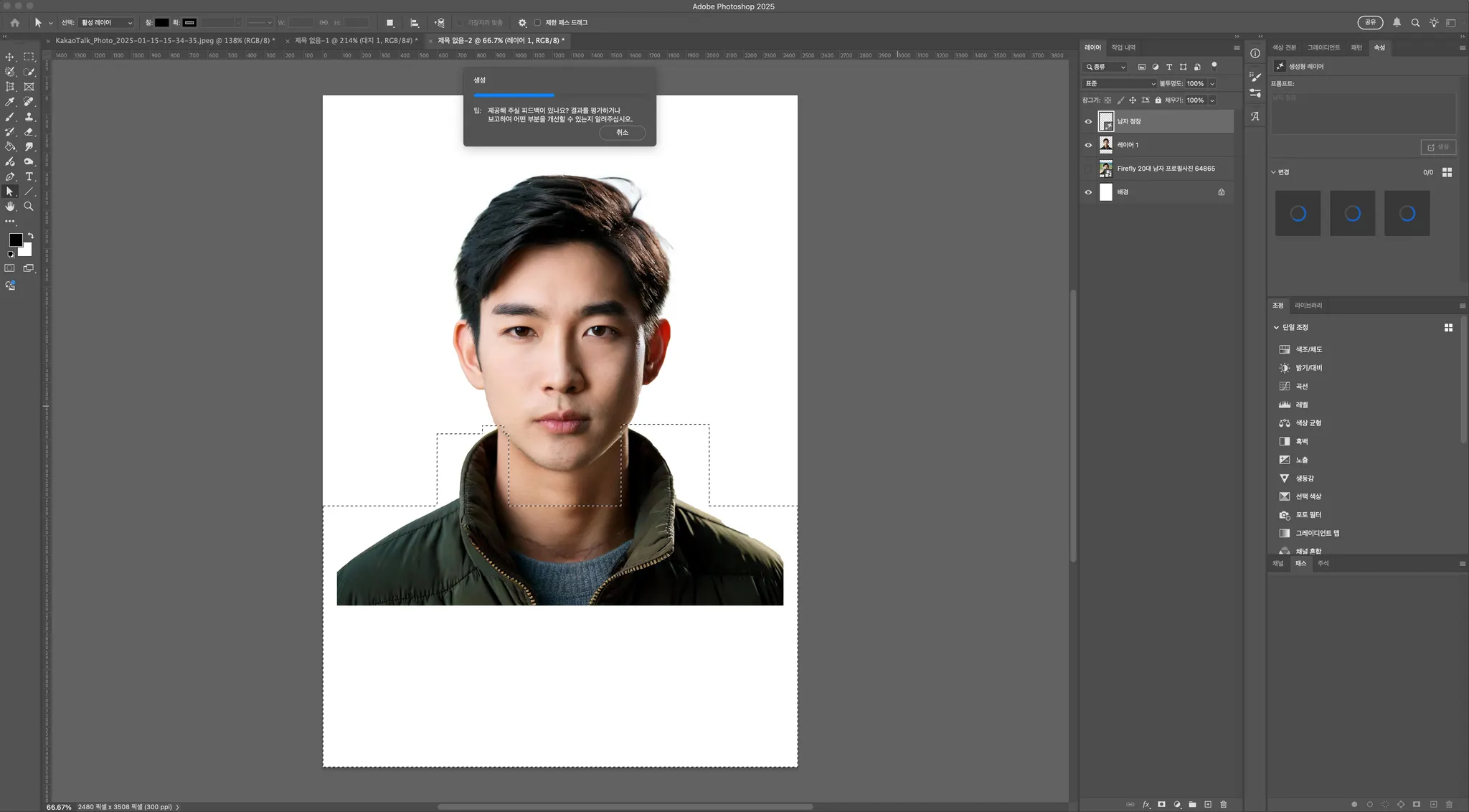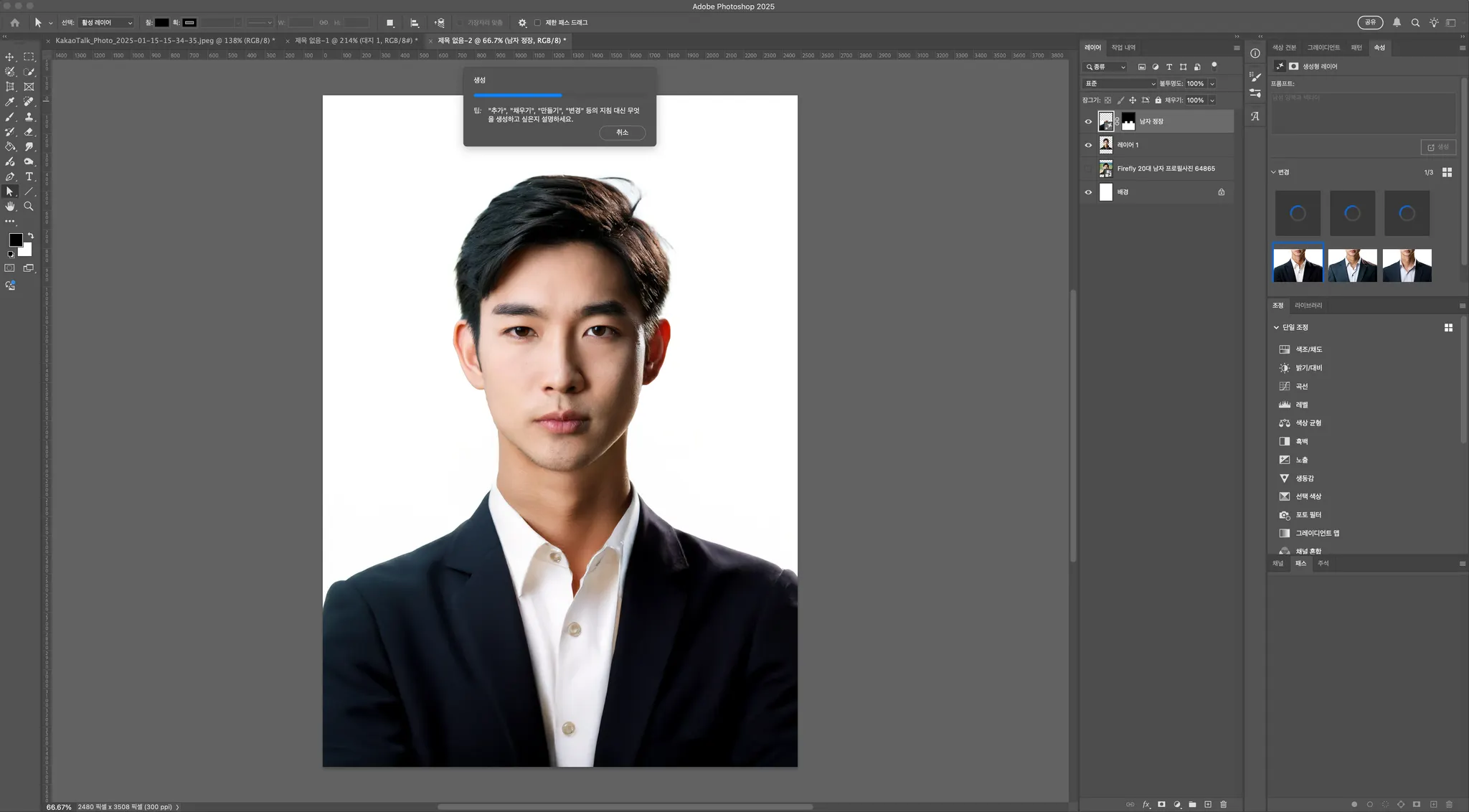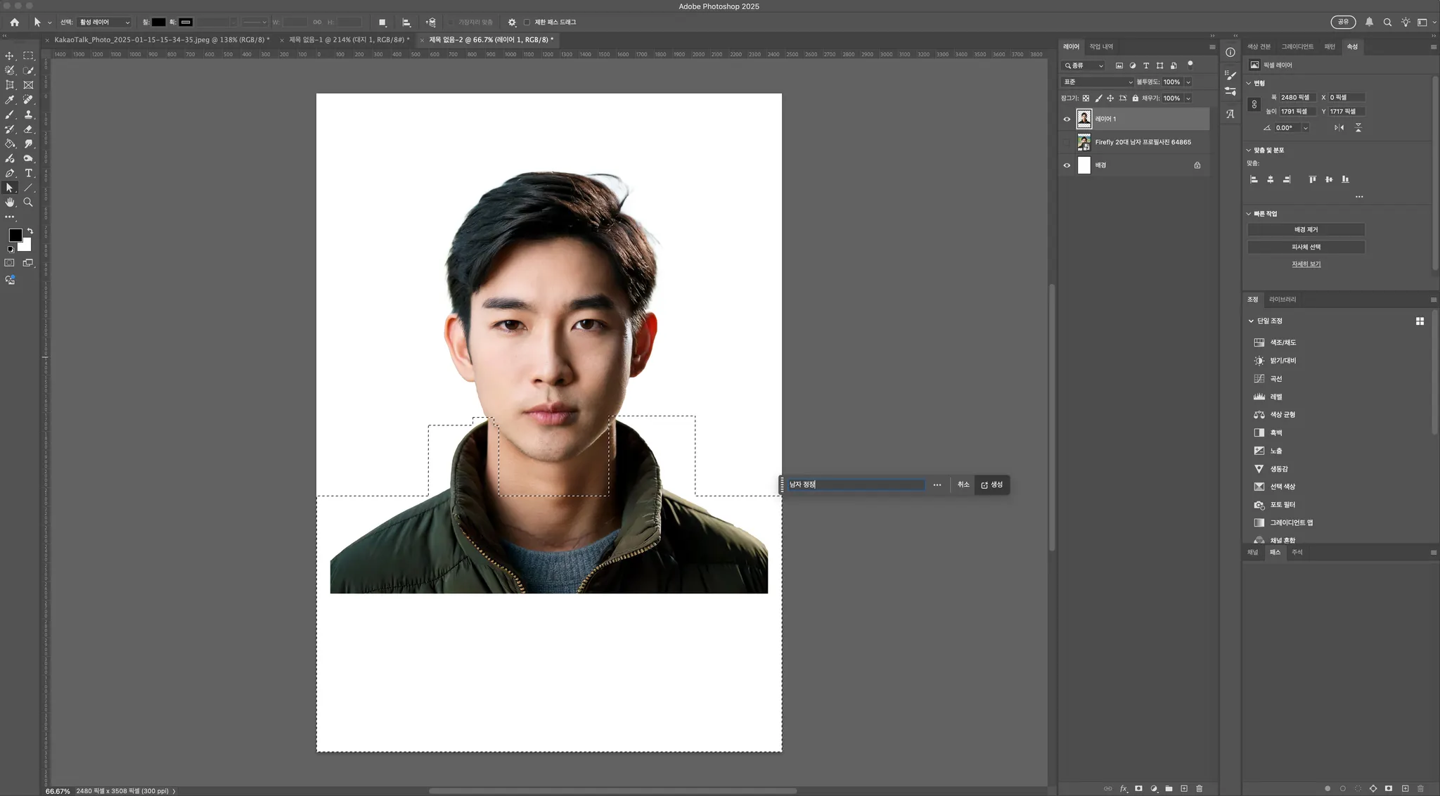 생성형 채우기를 클릭하신 뒤, 명령어를 입력하는 창에 원하시는 스타일을 작성해주세요. 저는 ‘남자 정장’ 이라는 키워드를 작성했습니다.