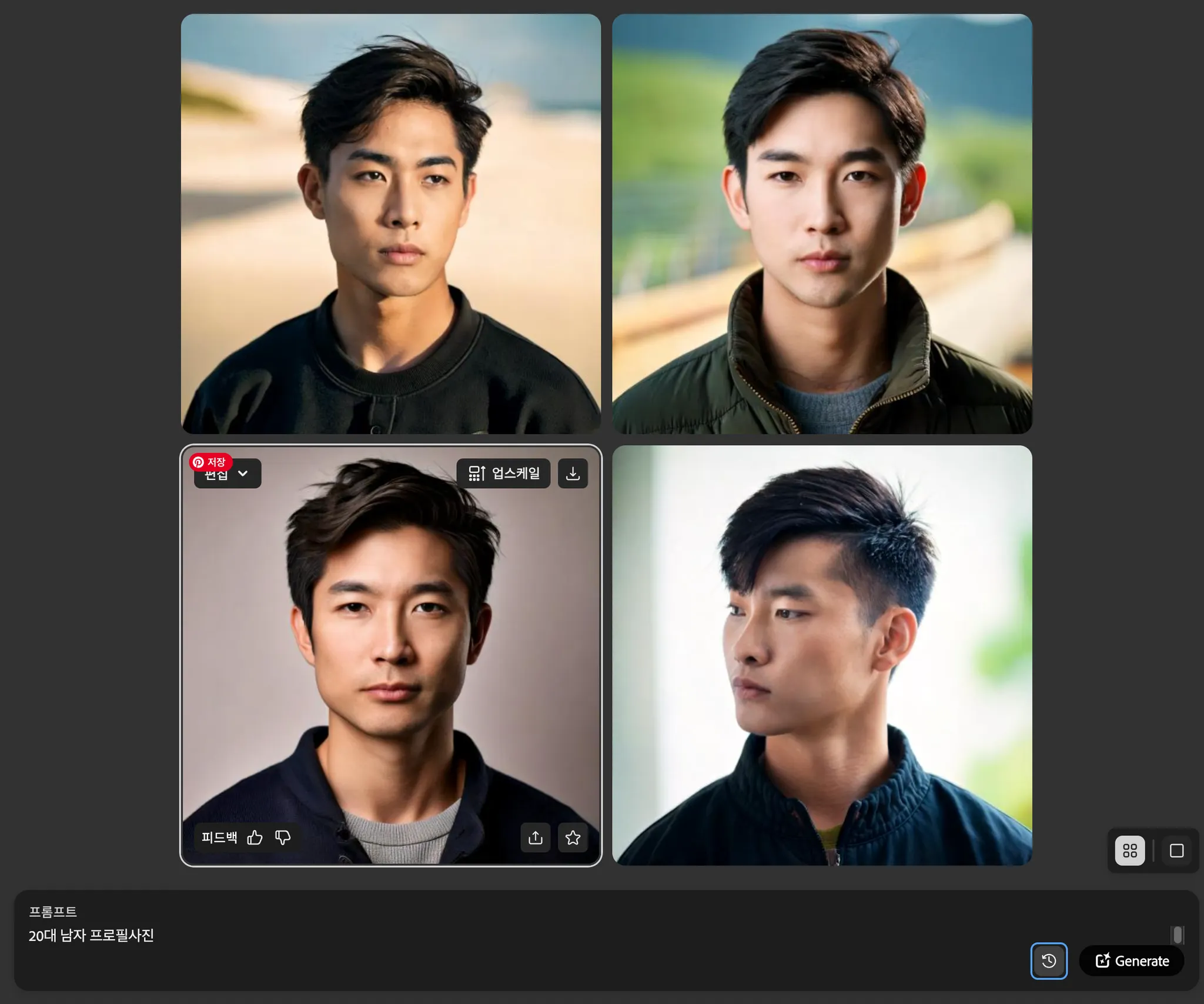 생성된 이미지는 업스케일을 눌러주신 뒤, 오른쪽 상단 다운로드 버튼을 클릭하시면 됩니다.
