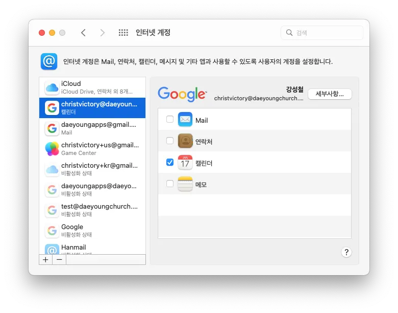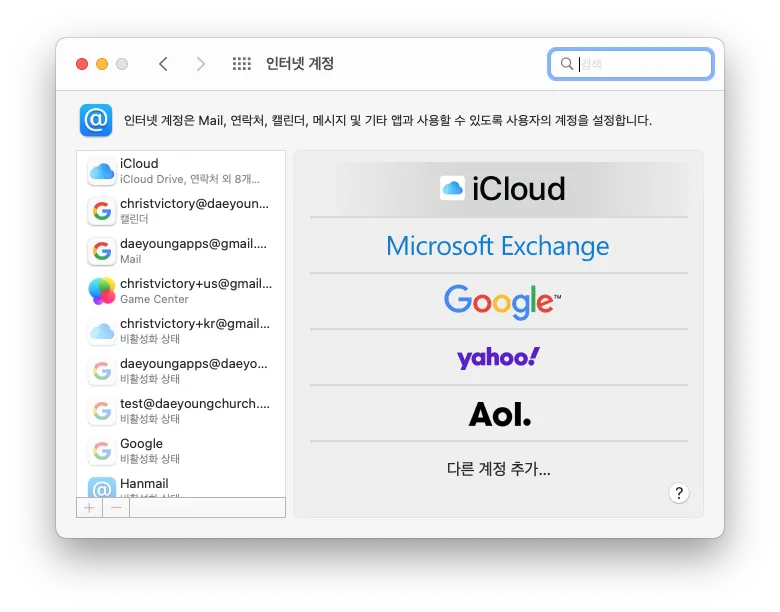 인터넷 계정 설정에서 구글을 추가 합니다.