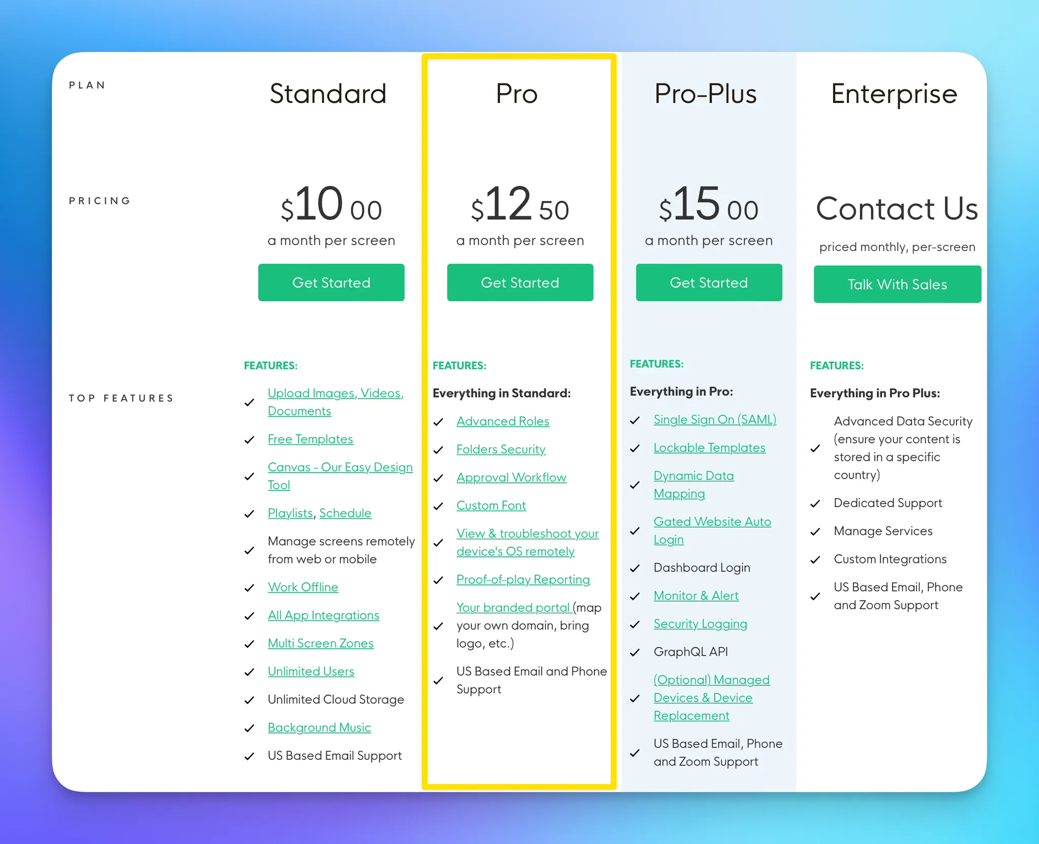 사실 비용적인 측면에서 Optisigns 를 상대할 앱은 없었다. 기본 요금 1스크린/한달 에 10달러에 사용이 가능했다. 타사앱들은 그 보다 2배 혹은 5배 가량 비싼 요금을 지불해야했기에 앞으로 스크린을 확장하게 되고 터치식 인터렉티브 키오스크도 지원하기 때문이다.