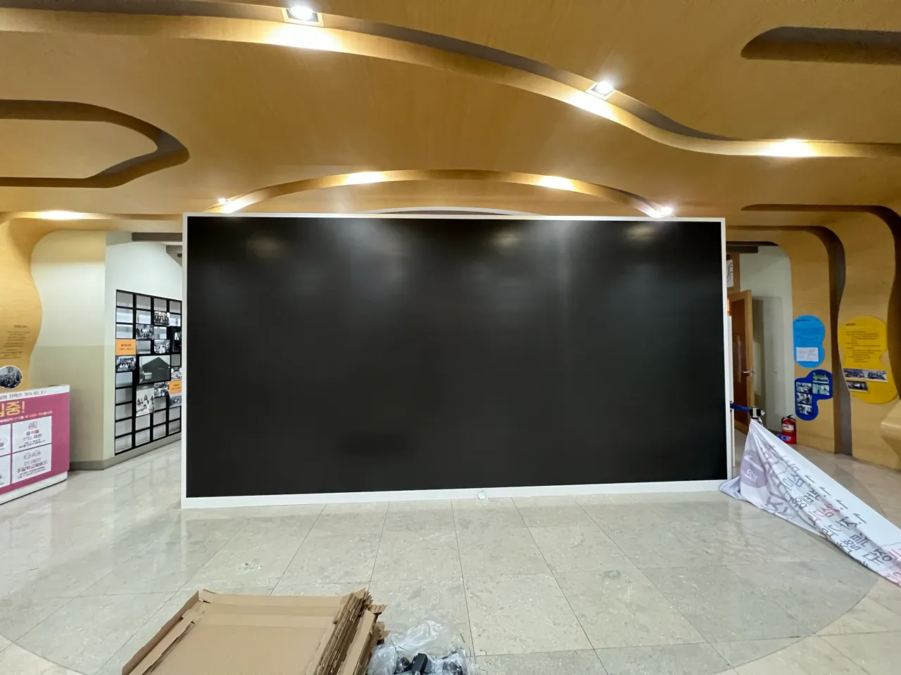 그래서 우선은 임시로 기존에 사용하던 안내봉을 설치하였다. 디자인을 헤치고 높이가 90cm 정도가 기본인 이러한 안내봉은 시야를 가려 컨텐츠를 제대로 보지 못하게 하는 문제점이 있었다. 하지만 접근을 제한하기에는 좋은 것 같다. 몇주간 지켜본 결과 저 선을 넘어서 들어가서 LED를 만져보는 경우는 잘 없었다. 그래서 30~40cm 낮은 안내봉을 설치해볼까 한다.