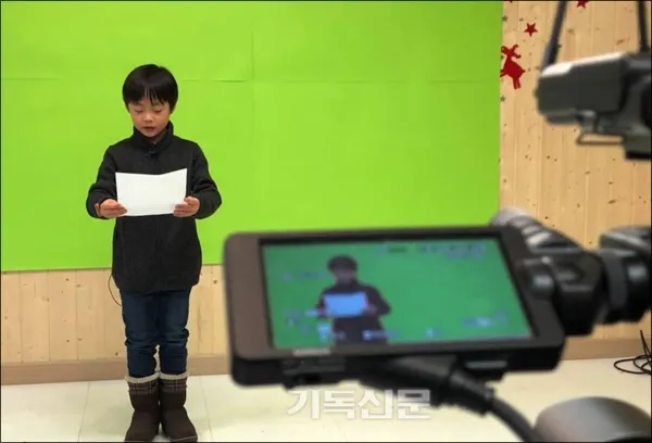 ▲ 한주교회(김태훈 목사) 아이들이 교회에서 방송 스피치를 연습하고 있다. 어린이들은 이 활동을 통해서 전도에 대해서 배웠다. 한주교회는 주일학교부터 성인까지 전 연령 대상 예배와 프로그램에 성도들이 참여하여 함께 만들어 갈 수 있게 했다. 전문가들은 4차산업혁명시대의 주일학교 교육이 지식전달에 머물러서는 무의미하다고 말한다.