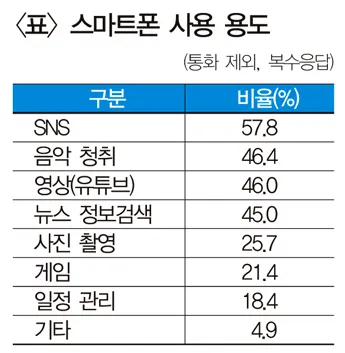 특히 영상을 접하게 되는 방법은 스마트폰(98.3%)과 게임 이용(34.4%)이 압도적으로 높았고 TV 매체 이용률은 상대적으로 낮았다. 또 스마트폰과 게임에 사용하는 시간은 하루 평균 4.5시간이었고 하루 종일 사용한다는 응답도 열 명 중 한 명꼴이었다. 청년들이 주로 사용하는 스마트폰의 용도는 SNS(57.8%)가 가장 높았고, 음악청취(46.4%), 영상(46.0%), 게임(21.4%) 순이었다.